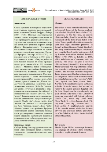 Ключевые фразы: Сибирь, байер, миллер, рукописные словники, язык сибирских татар, СЕМАНТИКА, ЭТИМОЛОГИЯ, графико-фонетические особенности