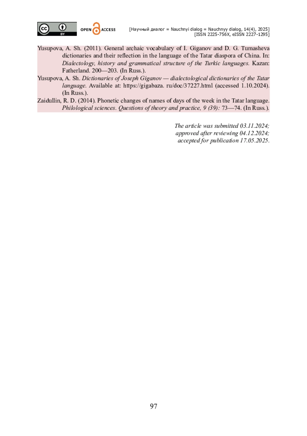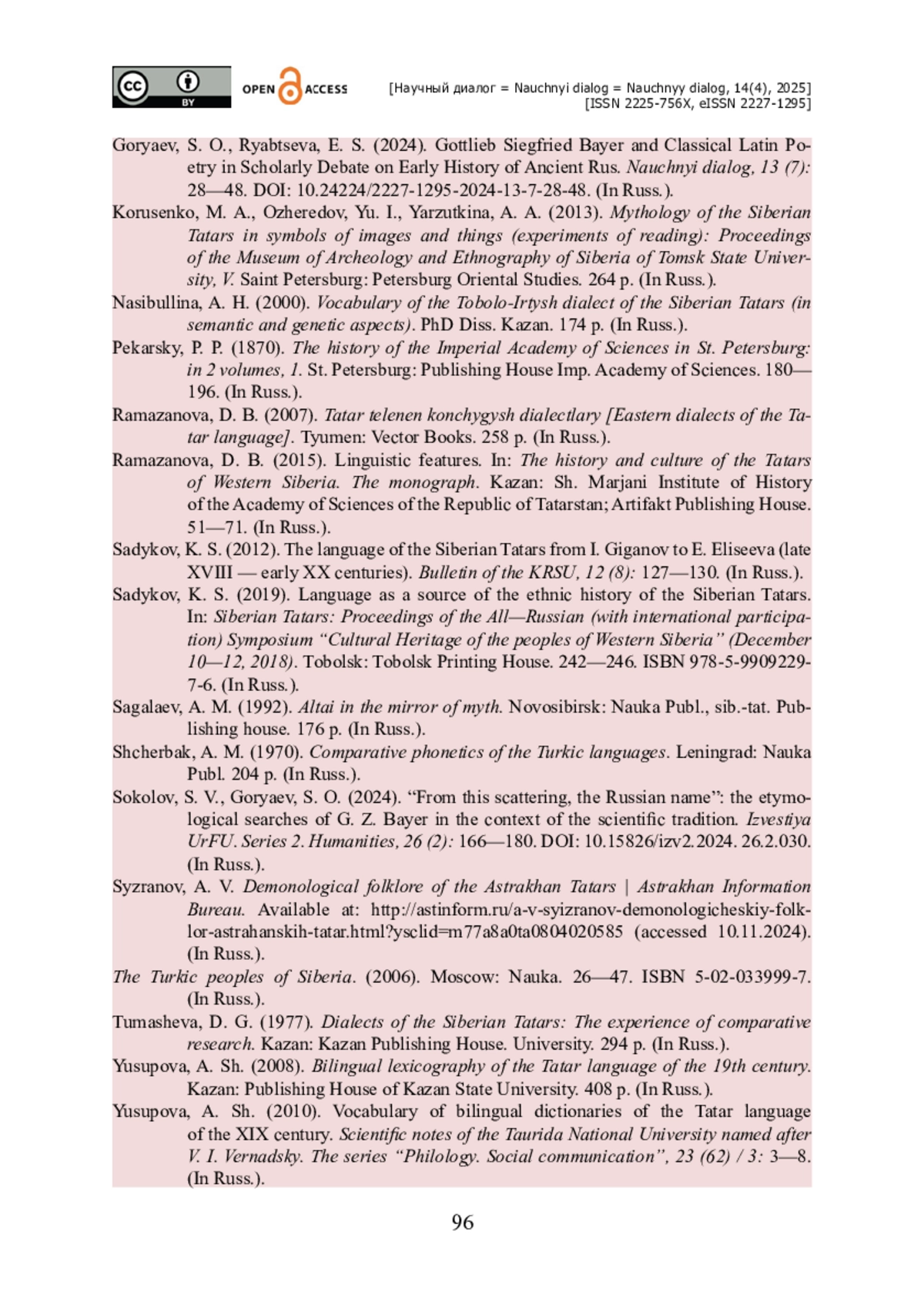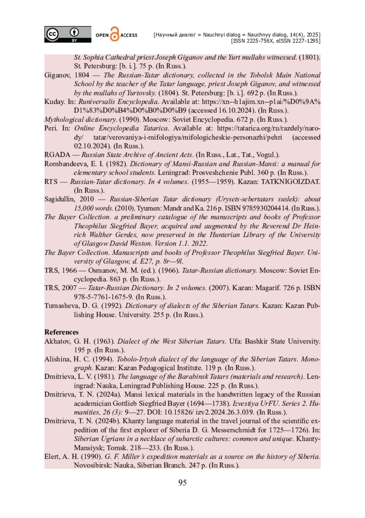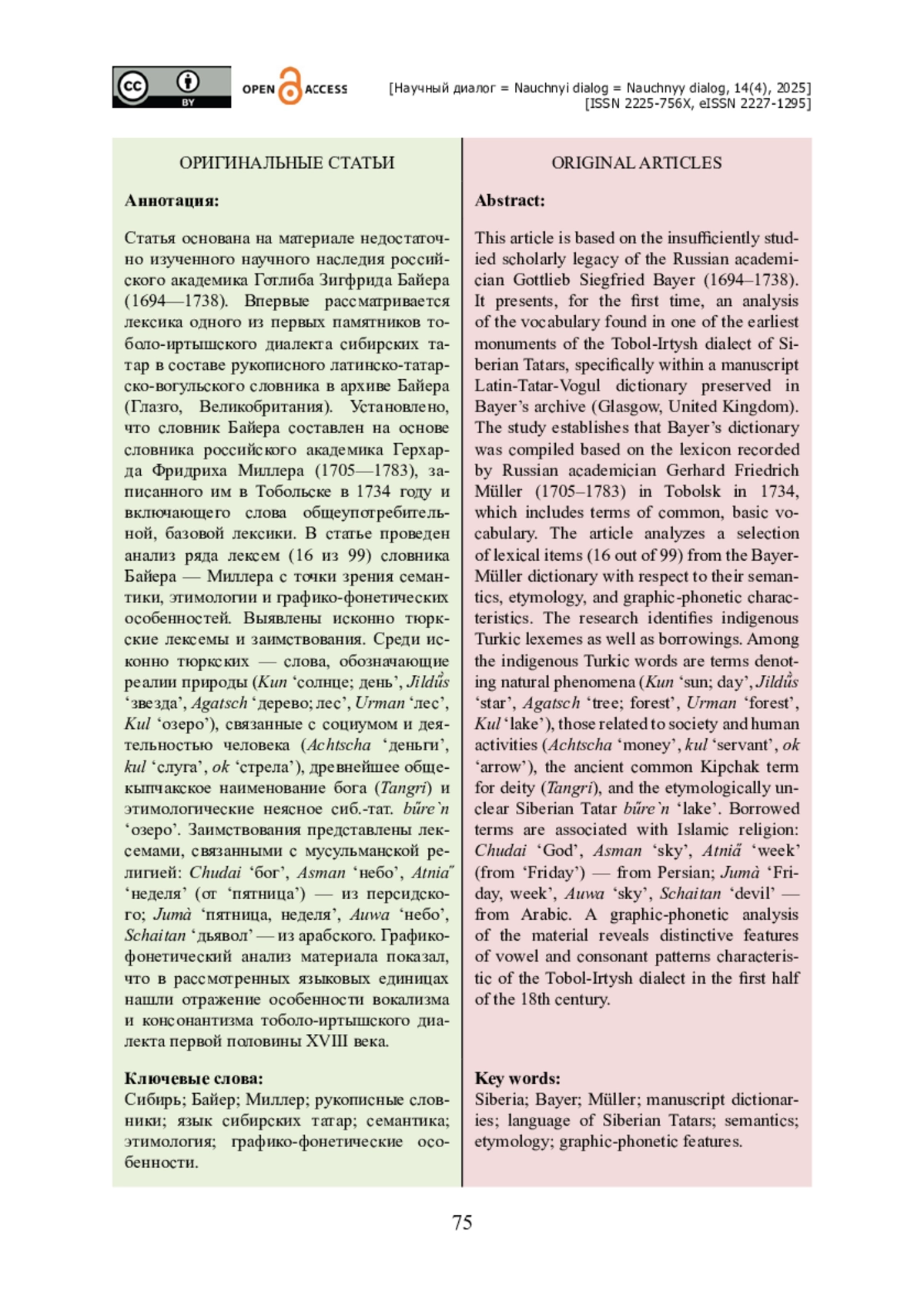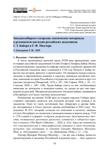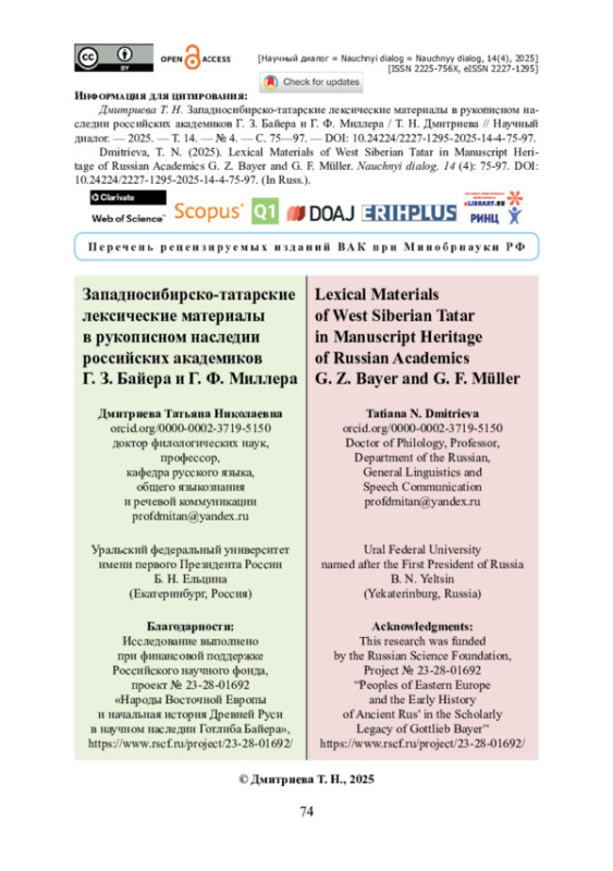ДМИТРИЕВА Т. Н. ЗАПАДНОСИБИРСКО-ТАТАРСКИЕ ЛЕКСИЧЕСКИЕ МАТЕРИАЛЫ В РУКОПИСНОМ НАСЛЕДИИ РОССИЙСКИХ АКАДЕМИКОВ Г. З. БАЙЕРА И Г. Ф. МИЛЛЕРА // НАУЧНЫЙ ДИАЛОГ. 2025. ТОМ 14, № 4