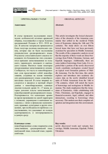 Сообщается, что часть из новообнаруженных слов представляют собой новообразования, созданные на основе типичных для среднеармянского языка словообразовательных моделей. В статье впервые исследуются и вводятся в научный оборот данные о новообнаруженных единицах лексики польских армян 16—17 веков, которые дополнят пласты заимствований и новообразований среднеармянского языка.