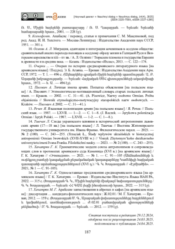 14. Тшечак Л. Следы украинского влияния в исторической антропонимии львовских армян (17-18 вв.) [на польском языке] / Л. Тшечак // Вестник Житомирского государственного университета им. Ивана Франко. Филологические науки. - 2023. - № 2 (100). - С. 243-255. (Trzeciak Ł., Ślady wpływów ukraińskich w historycznej antroponimii Ormian lwowskich (XVII-XVIII w.) // Visnyk Zhytomyrs’koho derzhavnoho universytetu imeni Ivana Franka. Filolohichni nauky. - 2023. - № 2 (100). - С. 243-255).