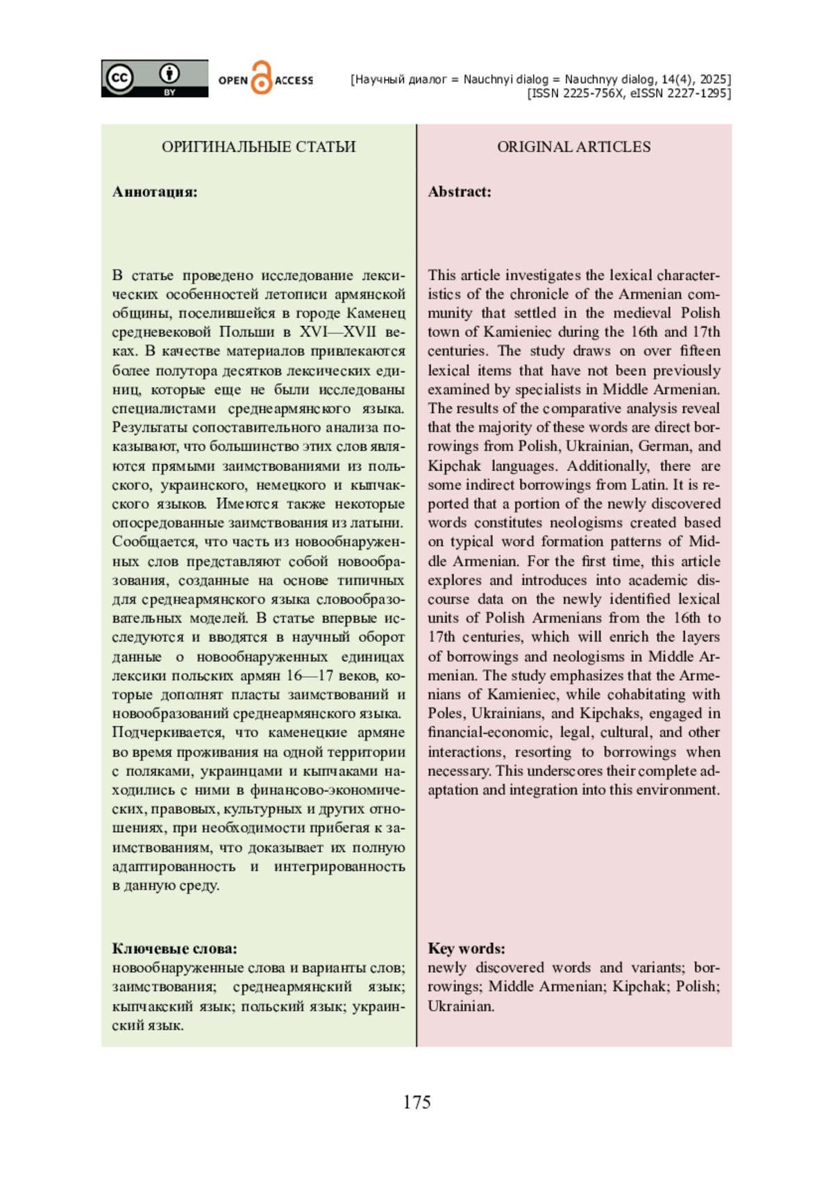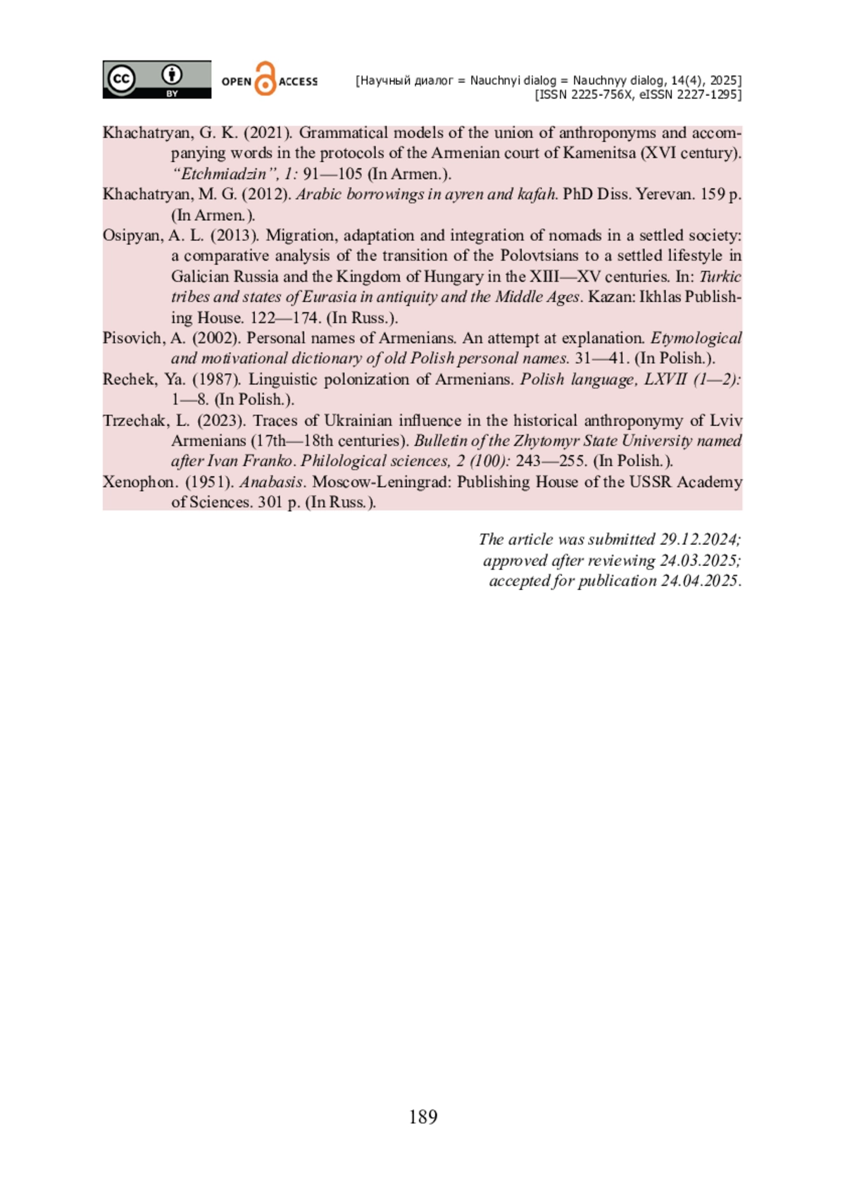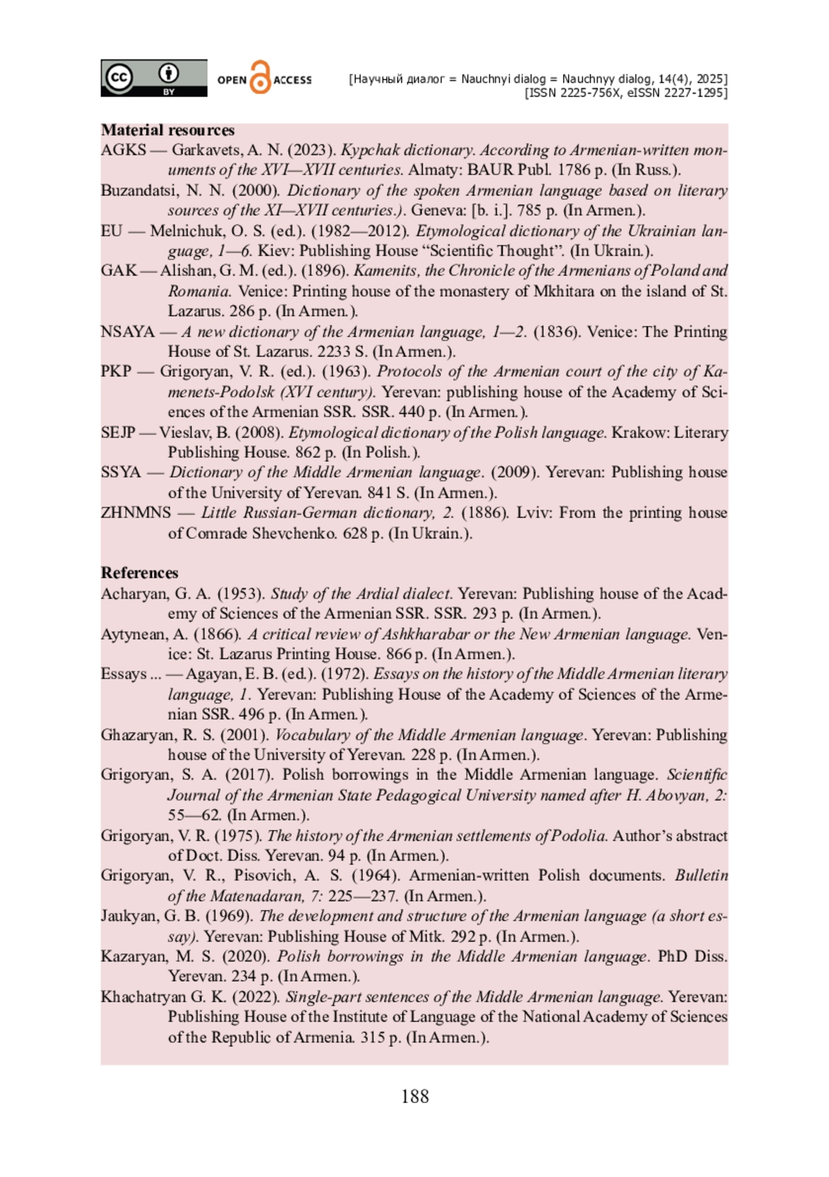 5. Григорян С. А. Польские заимствования в среднеармянском языке [на армянском языке] / С. А. Григорян // Научный журнал Армянского государственного педагогического университета им. Х. Абовяна. - 2017. - № 2. - С. 55-62. (Գրիգորյան Ս. Ա., Լեհական փոխառությունները միջին հայերենում / Ս. Ա. Գրիգորյան // Գիտական հանդես Խ. Աբովյանի անվան հայկական պետական մանկավարժական համալսարանի. - 2017. - № 2. - էջ 55-62).