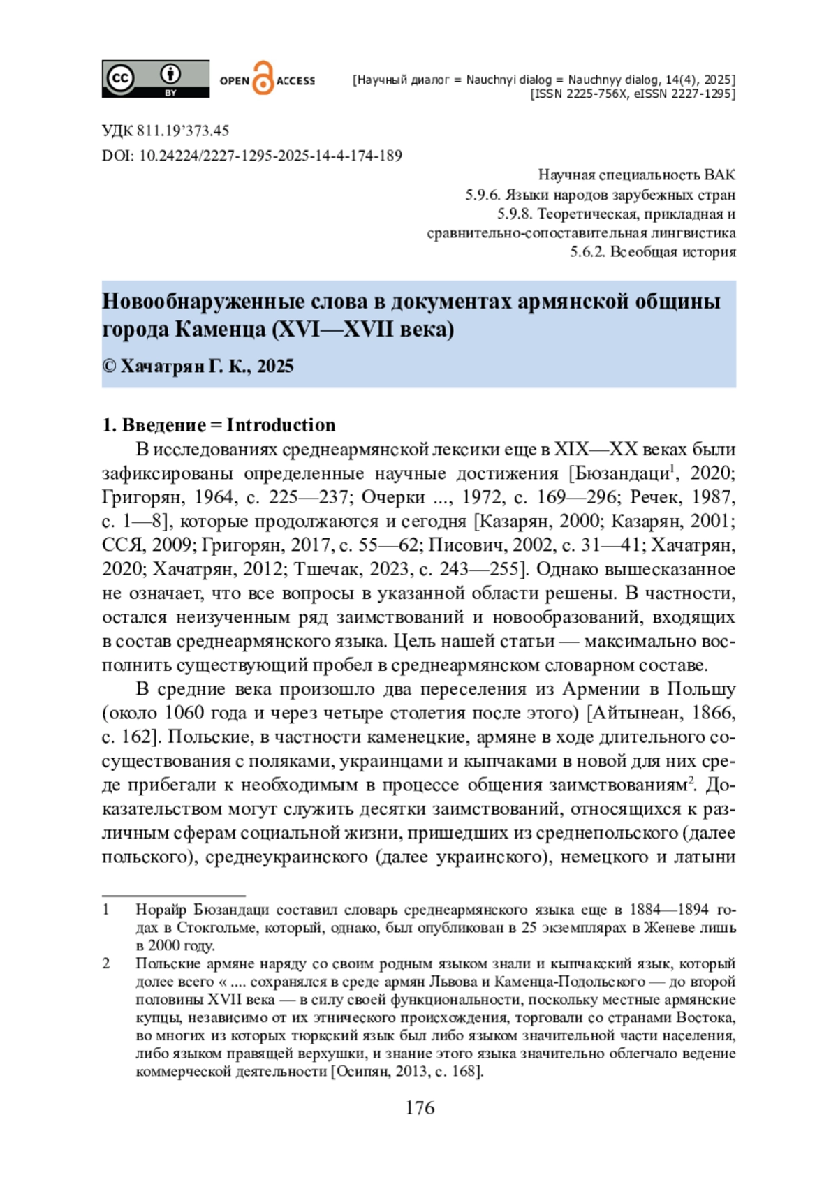 15. Хачатрян Г. К. Грамматические модели союза антропонимов и сопровождающих слов в протоколах армянского суда Каменица (XVI в.) [на армянском языке] / Г. К. Хачатрян // «Эчмиадзин». - 2021. - № 1. - С. 91-105 (Անձնանունների և ուղեկ¬ցող բառերի կապակցման քերականական կաղա¬պարները Կամեն¬իցի հայ¬կական դատա¬րա¬նի ար¬ձանագրու¬թ-յուն¬ներում (XVI դ.) / Գ. Կ. Խաչատրյան // «Էջմիածին». - 2021, № 1 - С. 91-105).