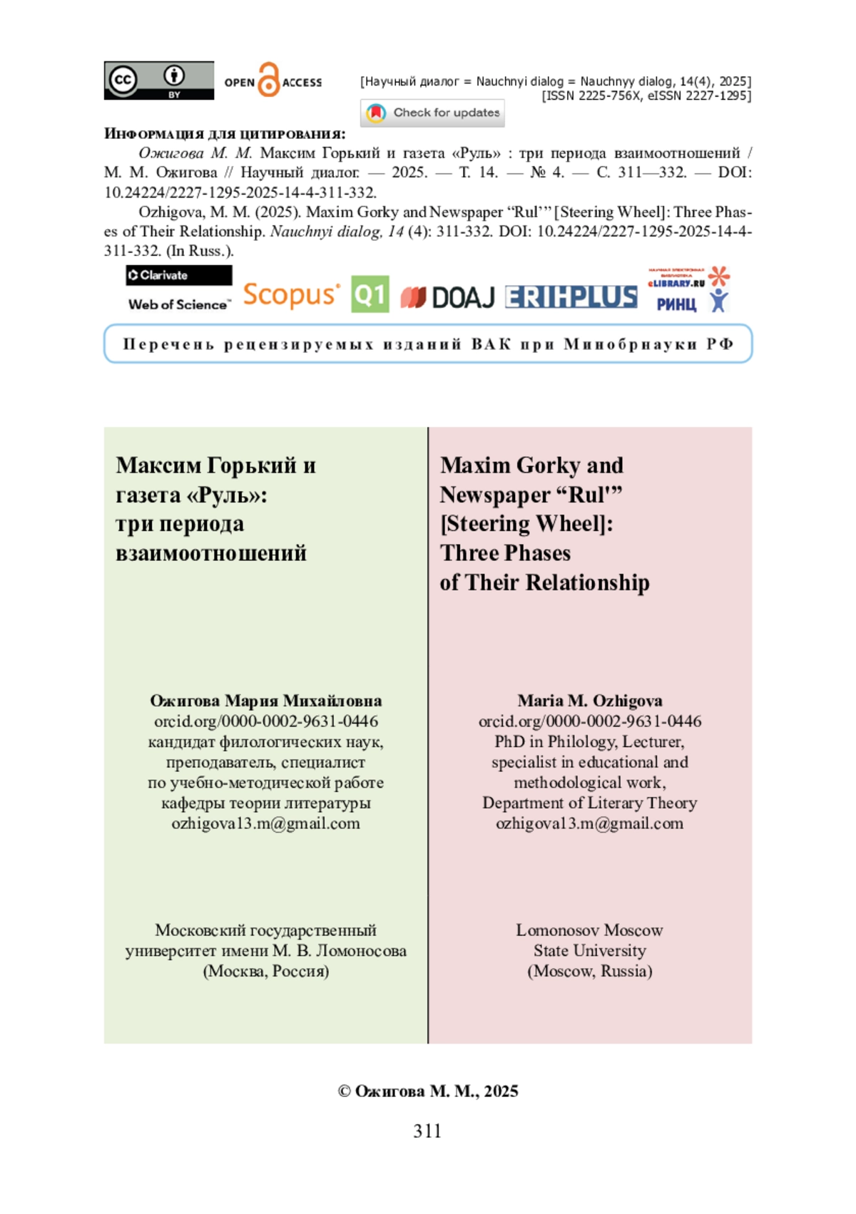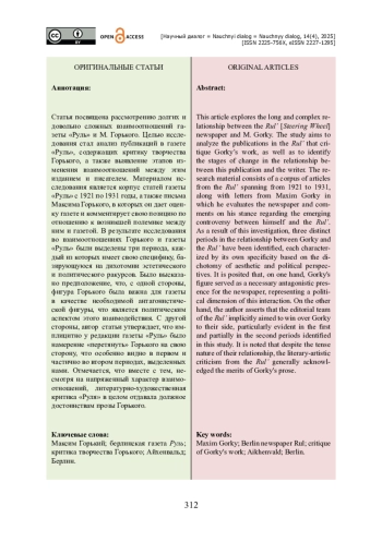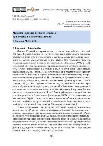Статья посвящена рассмотрению долгих и довольно сложных взаимоотношений газеты «Руль» и М. Горького. Целью исследования стал анализ публикаций в газете «Руль», содержащих критику творчества Горького, а также выявление этапов изменения взаимоотношений между этим изданием и писателем. Материалом исследования является корпус статей газеты «Руль» с 1921 по 1931 годы, а также письма Максима Горького, в которых он дает оценку газете и комментирует свою позицию по отношению к возникшей полемике между ним и газетой. В результате исследования во взаимоотношениях Горького и газеты «Руль» были выделены три периода, каждый из которых имеет свою специфику, базирующуюся на дихотомии эстетического и политического ракурсов. Было высказано предположение, что, с одной стороны, фигура Горького была важна для газеты в качестве необходимой антагонистической фигуры, что является политическим аспектом этого взаимодействия. С другой стороны, автор статьи утверждает, что имплицитно у редакции газеты «Руль» было намерение «перетянуть» Горького на свою сторону, что особенно видно в первом и частично во втором периодах, выделенных нами. Отмечается, что вместе с тем, несмотря на напряженный характер взаимоотношений, литературно-художественная критика «Руля» в целом отдавала должное достоинствам прозы Горького.