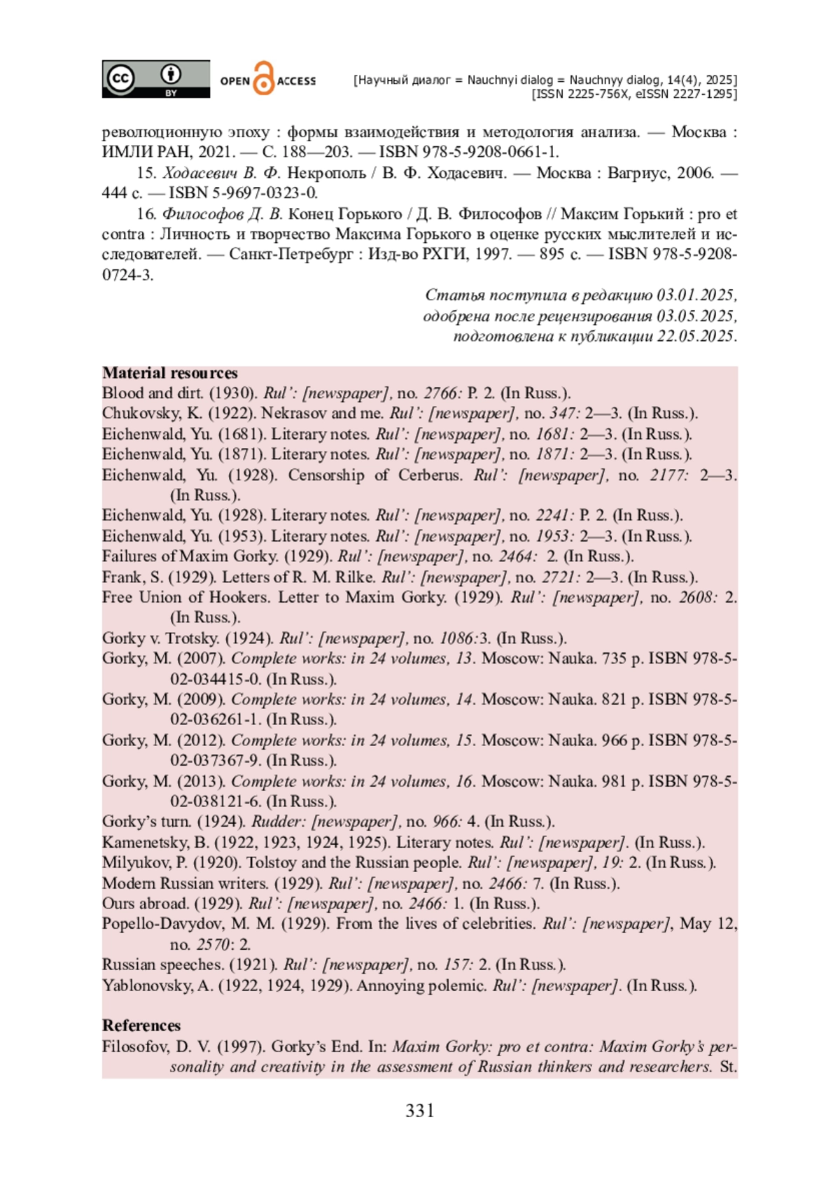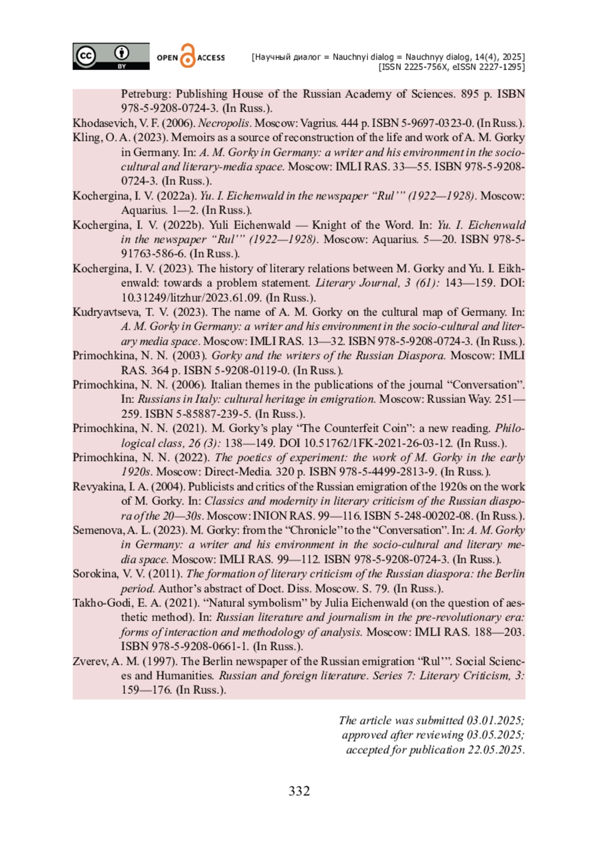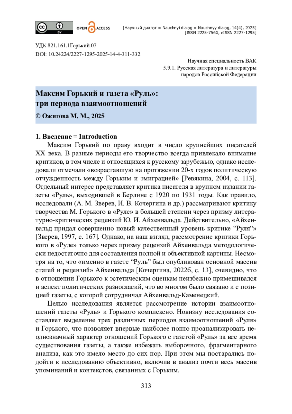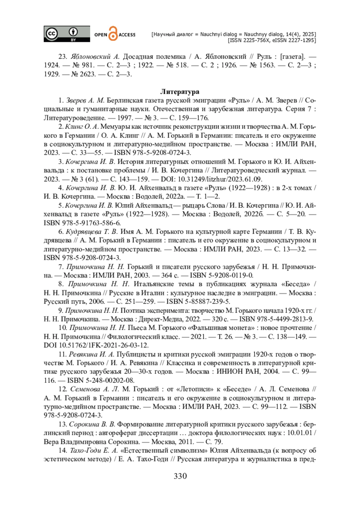 3. Кочергина И. В. История литературных отношений М. Горького и Ю. И. Айхенвальда : к постановке проблемы / И. В. Кочергина // Литературоведческий журнал. - 2023. - № 3 (61). - С. 143-159. - https://doi.org/10.31249/litzhur/2023.61.09.