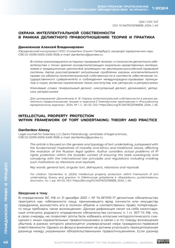В статье анализируются историко-правовой генезис и типология деликтного обязательства с точки зрения основополагающих морально-нравственных императивов и традиционных ценностей, влияющих на эволюцию российской правовой системы. Автор рассматривает актуальные проблемы охраны исключительного права на объекты интеллектуальной собственности в контексте обеспечения государственного суверенитета и соблюдения международно-правовых принципов и норм, включая применение таких институтов, как реторсии и репрессалии.