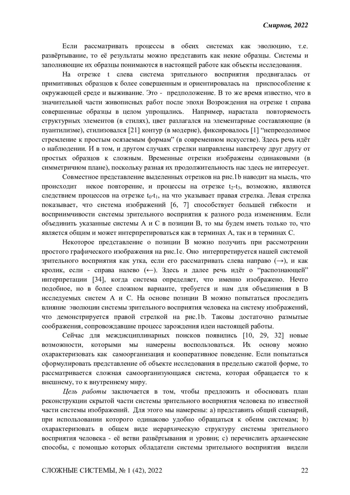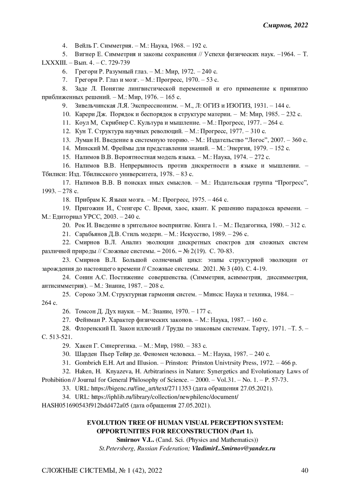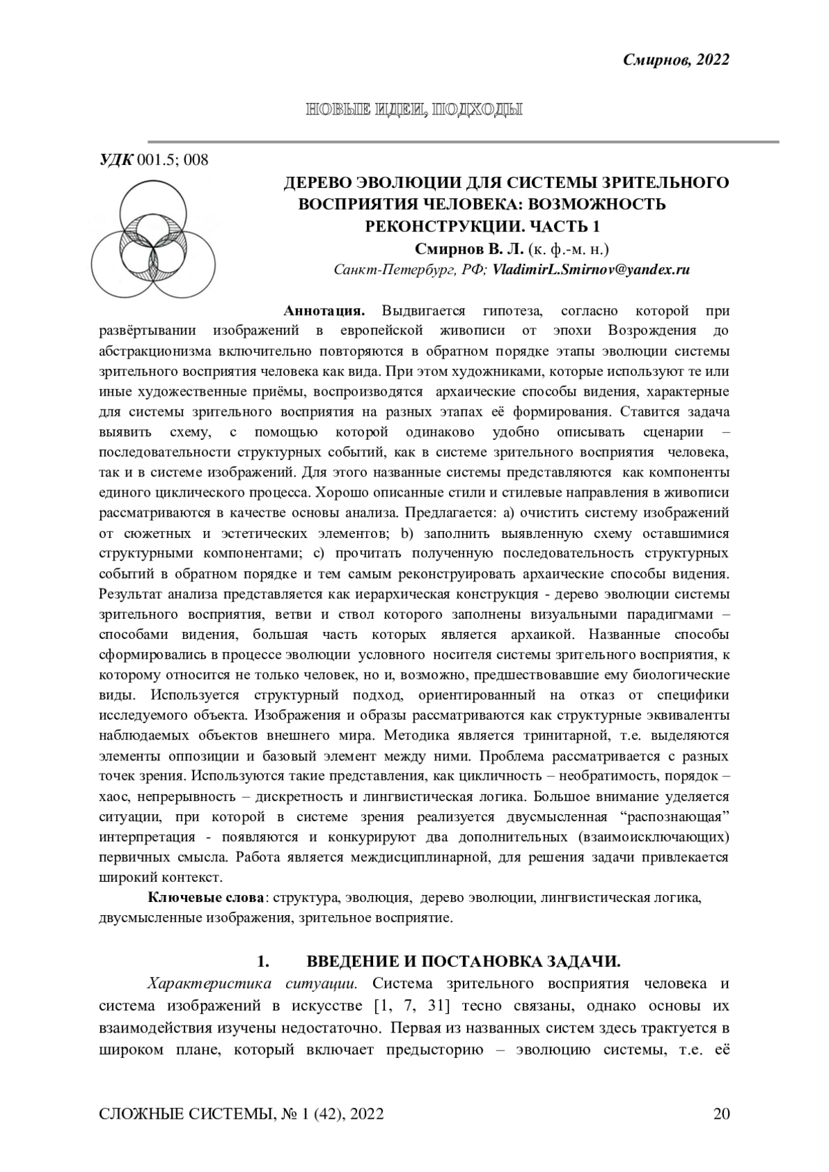 Выдвигается гипотеза, согласно которой при развёртывании изображений в европейской живописи от эпохи Возрождения до абстракционизма включительно повторяются в обратном порядке этапы эволюции системы зрительного восприятия человека как вида. При этом художниками, которые используют те или иные художественные приёмы, воспроизводятся архаические способы видения, характерные для системы зрительного восприятия на разных этапах её формирования. Ставится задача выявить схему, с помощью которой одинаково удобно описывать сценарии - последовательности структурных событий, как в системе зрительного восприятия человека, так и в системе изображений. Для этого названные системы представляются как компоненты единого циклического процесса. Хорошо описанные стили и стилевые направления в живописи рассматриваются в качестве основы анализа. Предлагается: а) очистить систему изображений от сюжетных и эстетических элементов; b) заполнить выявленную схему оставшимися структурными компонентами; с) прочитать полученную последовательность структурных событий в обратном порядке и тем самым реконструировать архаические способы видения. Результат анализа представляется как иерархическая конструкция - дерево эволюции системы зрительного восприятия, ветви и ствол которого заполнены визуальными парадигмами - способами видения, большая часть которых является архаикой. Названные способы сформировались в процессе эволюции условного носителя системы зрительного восприятия, к которому относится не только человек, но и, возможно, предшествовавшие ему биологические виды. Используется структурный подход, ориентированный на отказ от специфики исследуемого объекта. Изображения и образы рассматриваются как структурные эквиваленты наблюдаемых объектов внешнего мира. Методика является тринитарной, т. е. выделяются элементы оппозиции и базовый элемент между ними. Проблема рассматривается с разных точек зрения. Используются такие представления, как цикличность - необратимость, порядок - хаос, непрерывность - дискретность и лингвистическая логика. Большое внимание уделяется ситуации, при которой в системе зрения реализуется двусмысленная “распознающая” интерпретация - появляются и конкурируют два дополнительных (взаимоисключающих) первичных смысла. Работа является междисциплинарной, для решения задачи привлекается широкий контекст.