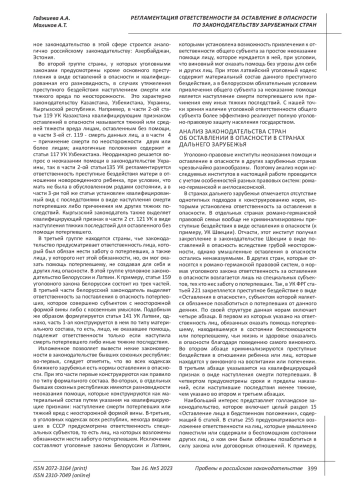 Статья: РЕГЛАМЕНТАЦИЯ ОТВЕТСТВЕННОСТИ ЗА ОСТАВЛЕНИЕ В ОПАСНОСТИ ПО ЗАКОНОДАТЕЛЬСТВУ ЗАРУБЕЖНЫХ СТРАН: ПОЗИТИВНЫЙ ОПЫТ И ЗНАЧЕНИЕ ДЛЯ УГОЛОВНОГО ПРАВА РОССИИ (2023)