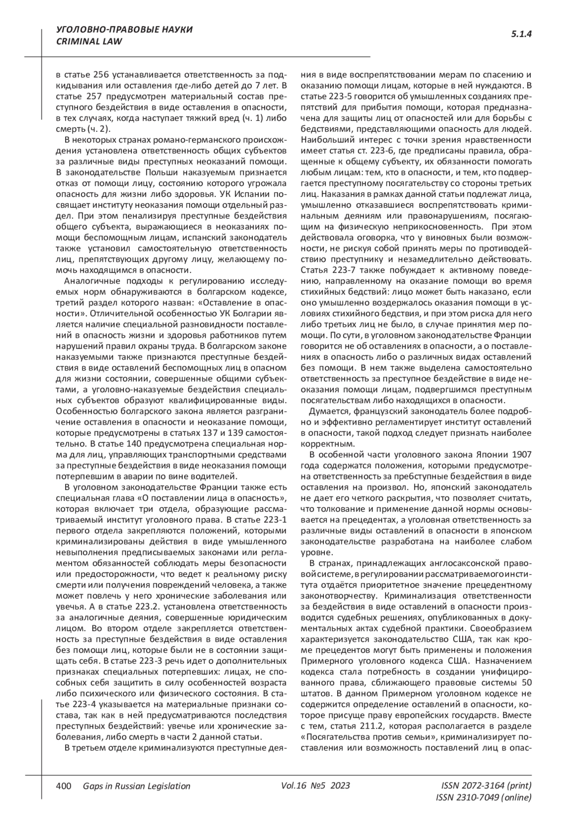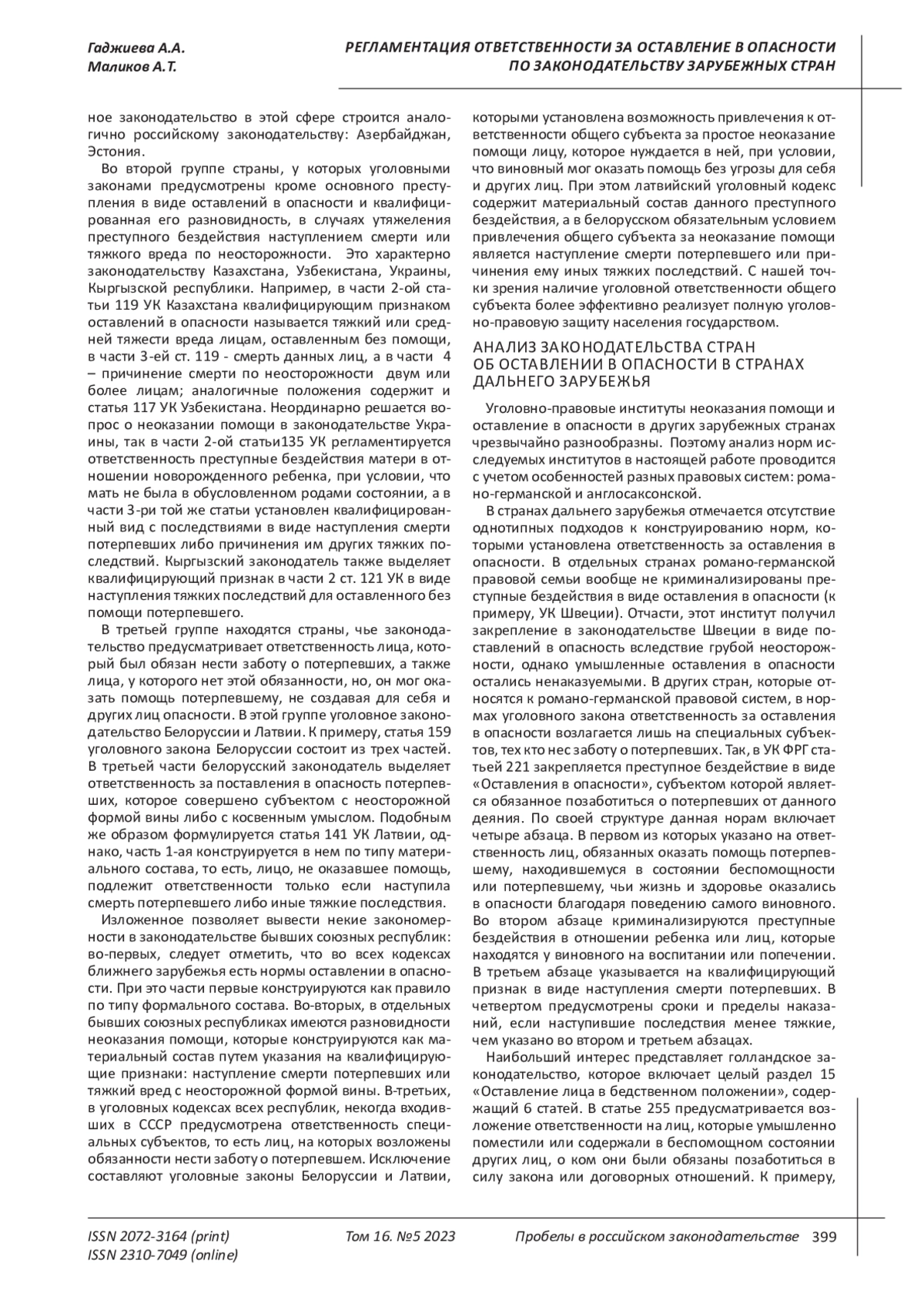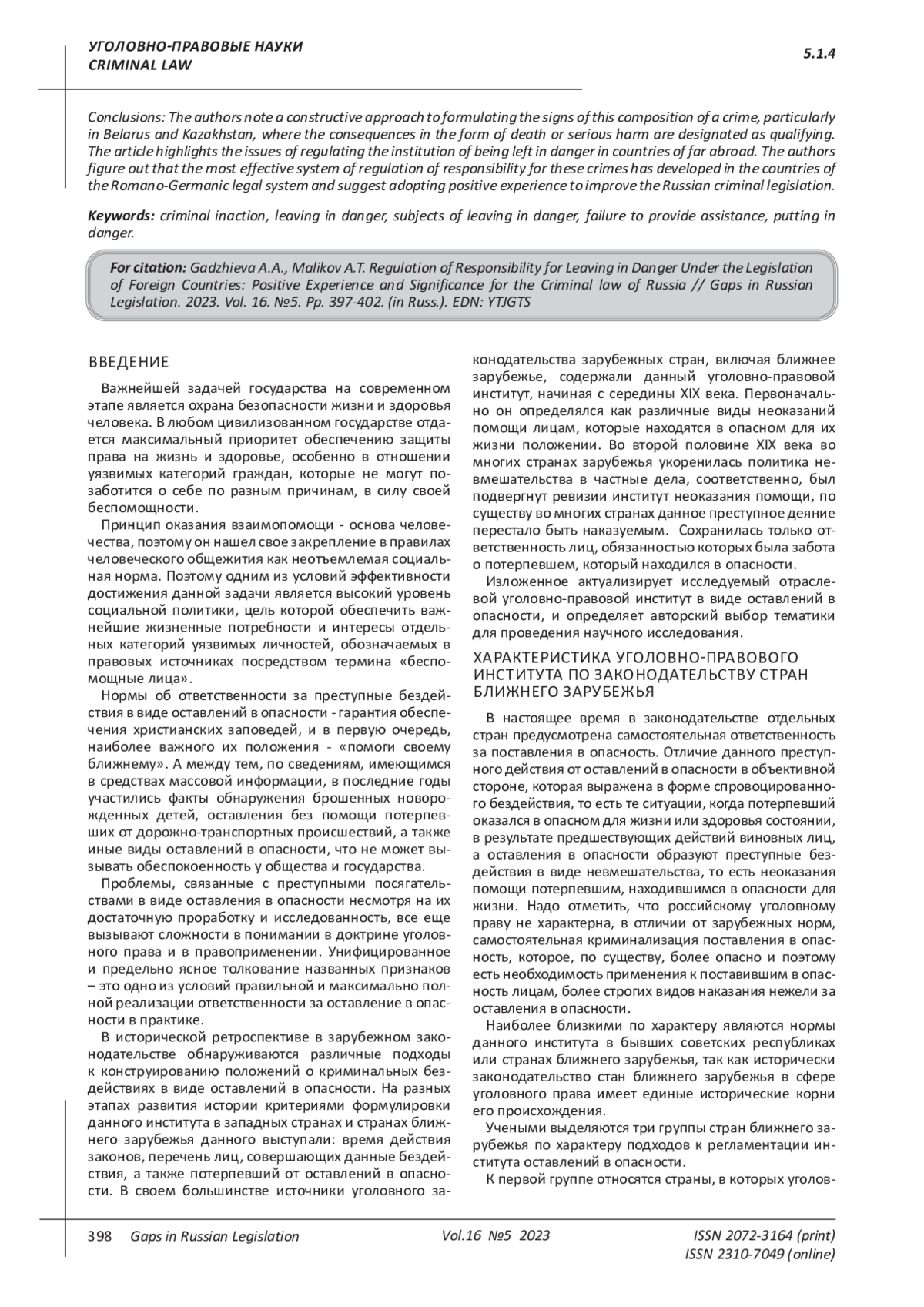 МАЛИКОВ А. Т., ГАДЖИЕВА А. А. РЕГЛАМЕНТАЦИЯ ОТВЕТСТВЕННОСТИ ЗА ОСТАВЛЕНИЕ В ОПАСНОСТИ ПО ЗАКОНОДАТЕЛЬСТВУ ЗАРУБЕЖНЫХ СТРАН: ПОЗИТИВНЫЙ ОПЫТ И ЗНАЧЕНИЕ ДЛЯ УГОЛОВНОГО ПРАВА РОССИИ // ПРОБЕЛЫ В РОССИЙСКОМ ЗАКОНОДАТЕЛЬСТВЕ. 2023. Т. 16 № 5