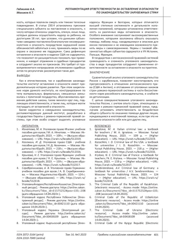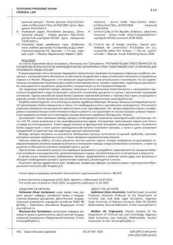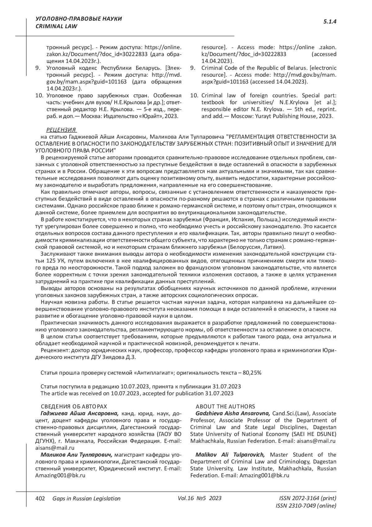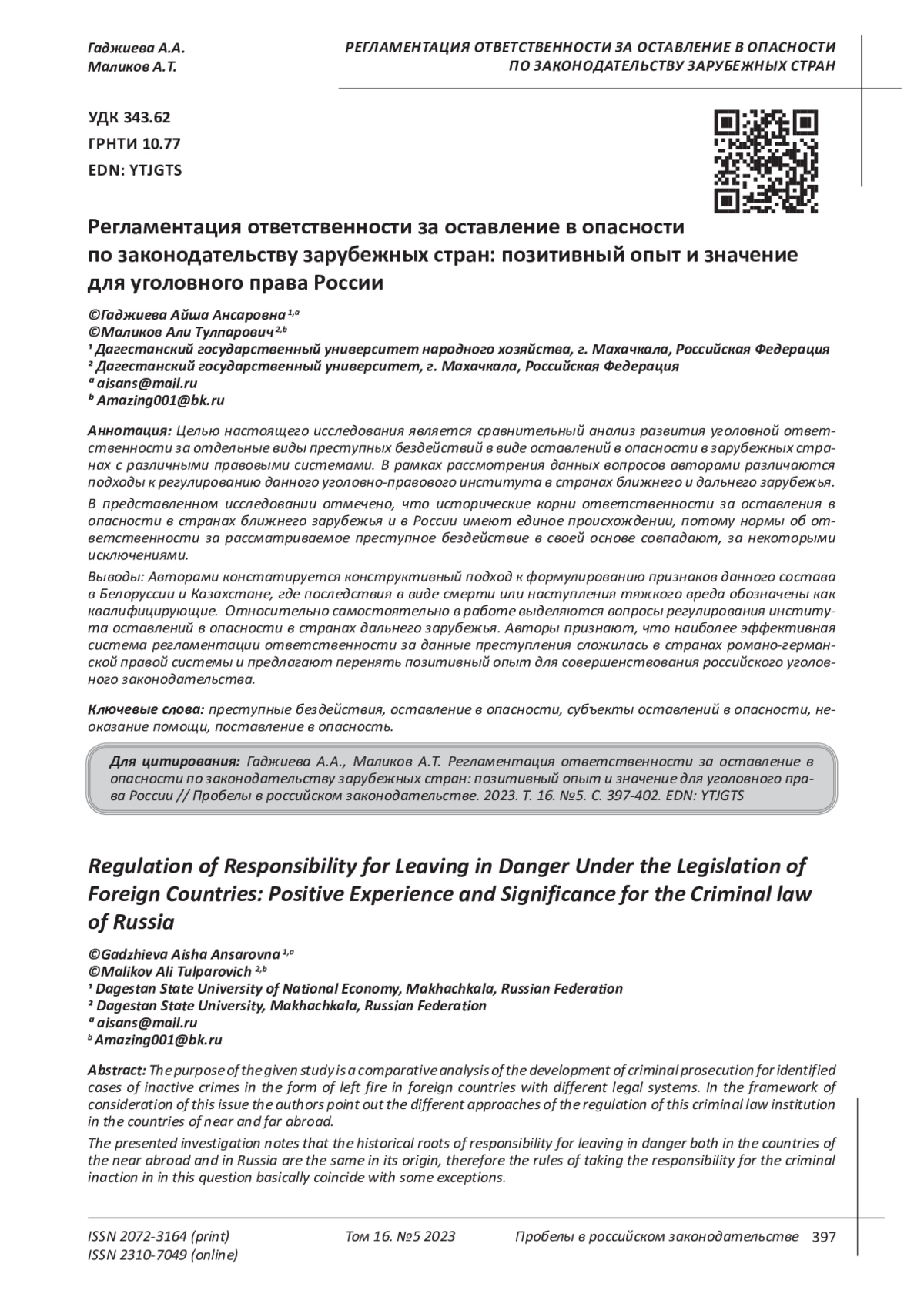 МАЛИКОВ А. Т., ГАДЖИЕВА А. А. РЕГЛАМЕНТАЦИЯ ОТВЕТСТВЕННОСТИ ЗА ОСТАВЛЕНИЕ В ОПАСНОСТИ ПО ЗАКОНОДАТЕЛЬСТВУ ЗАРУБЕЖНЫХ СТРАН: ПОЗИТИВНЫЙ ОПЫТ И ЗНАЧЕНИЕ ДЛЯ УГОЛОВНОГО ПРАВА РОССИИ // ПРОБЕЛЫ В РОССИЙСКОМ ЗАКОНОДАТЕЛЬСТВЕ. 2023. Т. 16 № 5