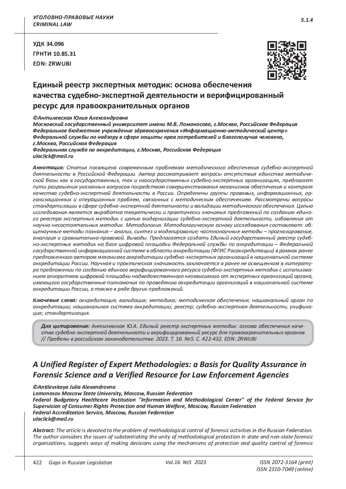 Antilevskaya Y.A. National system of accreditation of Russia - a legal way to improve domestic forensic expertise // Gaps in Russian legislation. 2022. № 6. P. 264-274. EDN: ZLVAFP