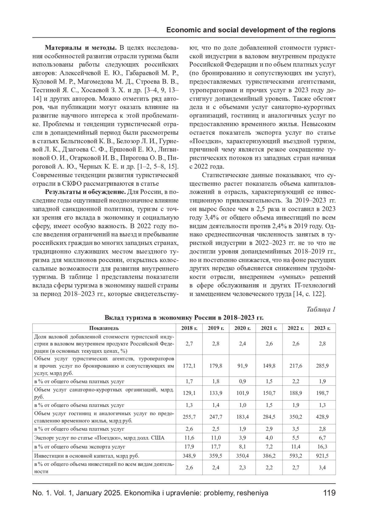 Целью исследования является анализ особенностей современного развития туристской отрасли в России и регионах Северного Кавказ. Задачами исследования являются определение тенденций развития туризма в России, обоснование их влияния на потребительские предпочтения российских туристов, на характер поведения государства, туристических компаний на рынке соответствующих услуг. При проведении исследования были использованы методы статистического и научного анализа, наблюдения, сравнения, предположения. На основе данных Росстата анализируется вклад сферы туризма в экономику Российской Федерации, проведен анализ основных показателей развития отрасли туризма за 2018-2023 гг. и первую половину 2024 года; выявлены причины и факторы, обусловившие непредвиденные прежде изменения, обоснована их важность для России и регионов, ощущающих влияние западных санкций во многих сферах. Анализируются такие показатели туристической сферы, как численность лиц, размещенных в коллективных средствах размещения и в санаторно-курортных организациях, число въездных и выездных туристских поездок, пассажирооборот, причинами значительного роста которых в 2024 году авторами называются рост потребительского спроса и соответствующий ему рост предложения. На материалах региональной статистики Северо-Кавказского федерального округа проведен сравнительный анализ таких важнейших показателей развития отрасли, как число поездок и количество ночевок, приведены факторы, способствующие перераспределению туристских потоков между регионами Северо-Кавказского федерального округа. Авторами выявлены две важные макрорегиональные тенденции: более равномерное сезонное распределение туристических потоков и рост популярности альтернативных видов туризма. Результаты исследования могут послужить основой для более детального и обоснованного прогнозирования развития отрасли в ближайшей перспективе.