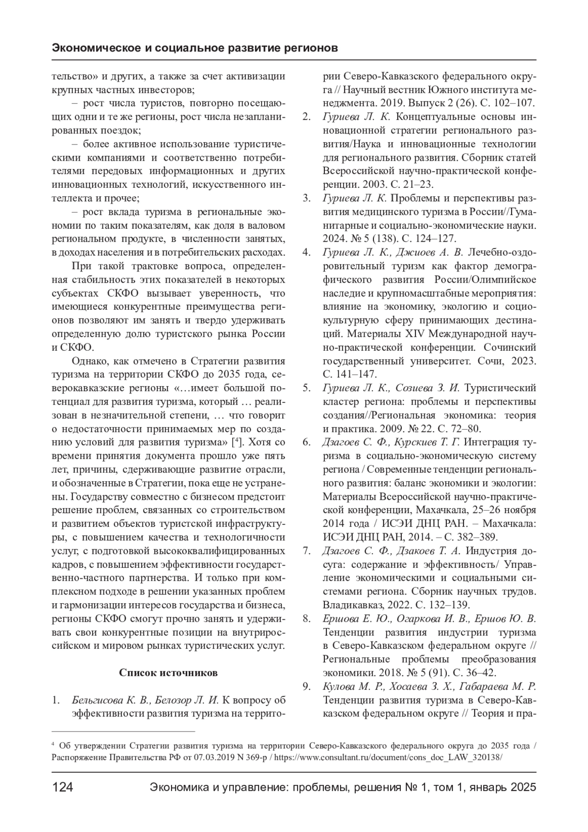 5. Гуриева Л. К., Созиева З. И. Туристический кластер региона: проблемы и перспективы создания//Региональная экономика: теория и практика. 2009. № 22. С. 72-80. EDN: KRRMRV
