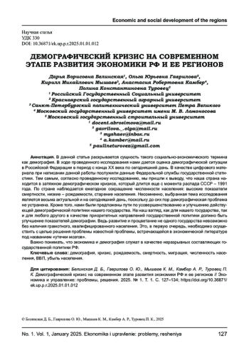 В данной статье раскрывается сущность такого социально-экономического термина как демография. В ходе проведенного исследования нами дается оценка демографической ситуации в Российской Федерации в период с конца ХХ века по сегодняшний день. В качестве цифрового материала при написании данной работы послужили данные Федеральной службы государственной статистики. Тем самым, согласно проведенному исследованию, мы пришли к выводу, что наша страна находится в затяжном демографическом кризисе, который длится еще с момента распада СССР - 1991 года. По стране наблюдается ежегодное сокращение численности населения: высокие показатели смертности, низкие - рождаемости, старение населения. Несомненно, выбранная тема исследования является весьма актуальной и на сегодняшний день, поскольку до сих пор демографическая проблема не устранена. Кроме того, нами были предложены пути по усовершенствованию и улучшению действующей демографической политики нашего государства. На наш взгляд, как для нашего государства, так и для любого другого в качестве приоритетных направлений государственной политики должно быть улучшение показателей демографии. Ведь развитие и процветание не одного государства невозможно без наличия грамотного, квалифицированного населения. Это, в первую очередь, необходимо осуществить с целью решения проблемы известной проблемы, встречающейся в экономической литературе под названием «утечки мозгов». Важно понимать, что экономика и демография служат в качестве неразрывных составляющих государственной политики РФ.