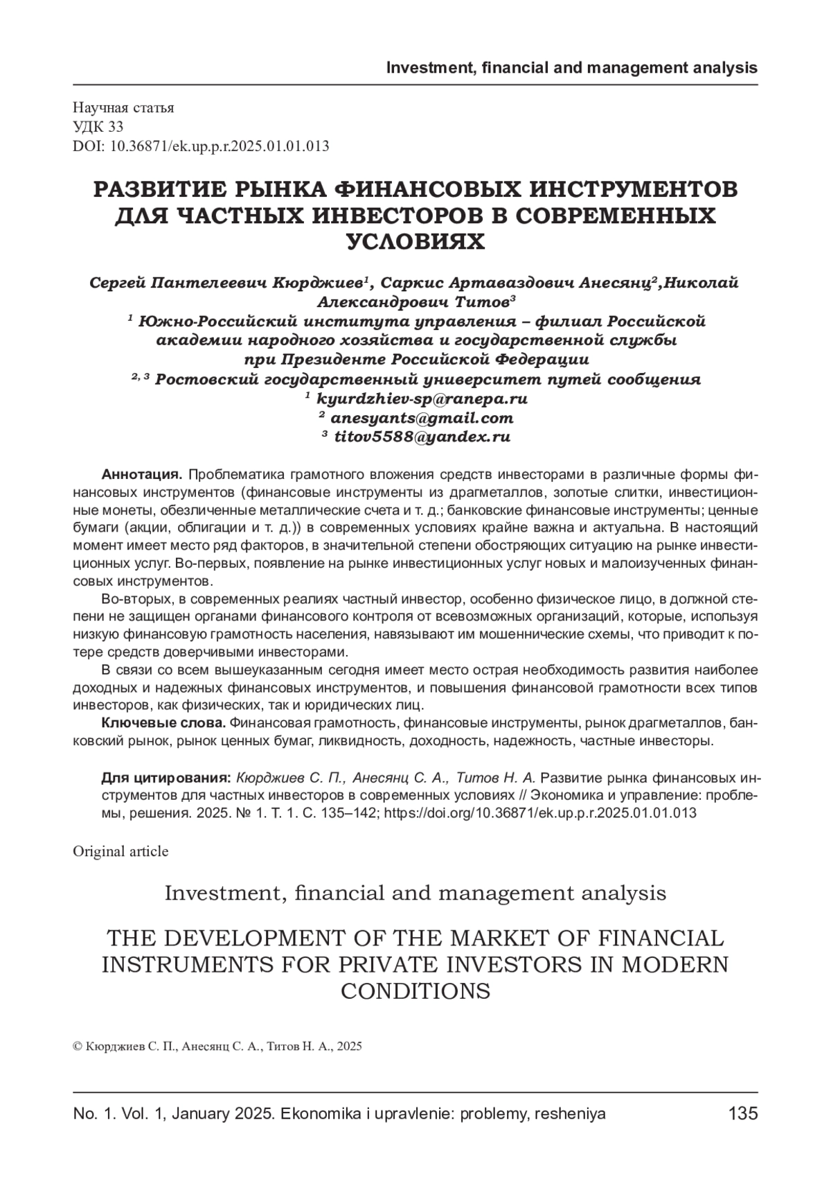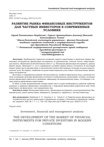КЮРДЖИЕВ С. П., АНЕСЯНЦ С. А., ТИТОВ Н. А. РАЗВИТИЕ РЫНКА ФИНАНСОВЫХ ИНСТРУМЕНТОВ ДЛЯ ЧАСТНЫХ ИНВЕСТОРОВ В СОВРЕМЕННЫХ УСЛОВИЯХ // ЭКОНОМИКА И УПРАВЛЕНИЕ: ПРОБЛЕМЫ, РЕШЕНИЯ. 2025. ТОМ 1 № 1