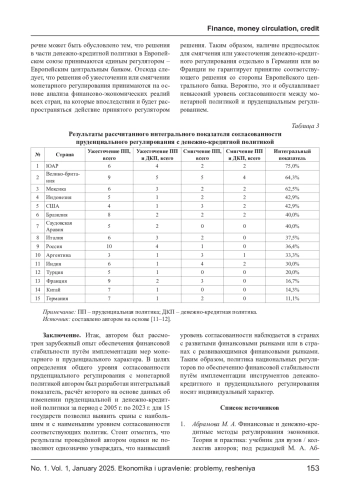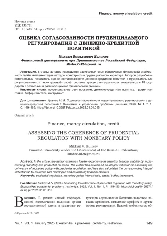 В статье автором исследуется зарубежный опыт обеспечения финансовой стабильности путём имплементации методов монетарного и пруденциального характера. Автором разработан интегральный показатель оценки согласованности денежно-кредитной политики с пруденциальным регулированием, а также проведён расчёт соответствующего интегрального показателя для 15 государств с развитыми и развивающимися финансовыми рынками.