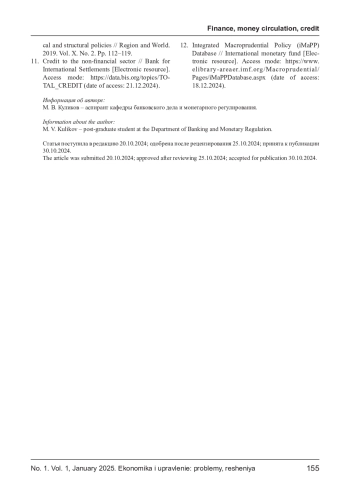 6. Кувшинова Ю. А., Вершинина О. В. Роль макропруденциальной политики Банка России в повышении устойчивости финансовых институтов // Инновационное развитие экономики. 2024. № 1 (79). С. 138-145. EDN: ZKICIN