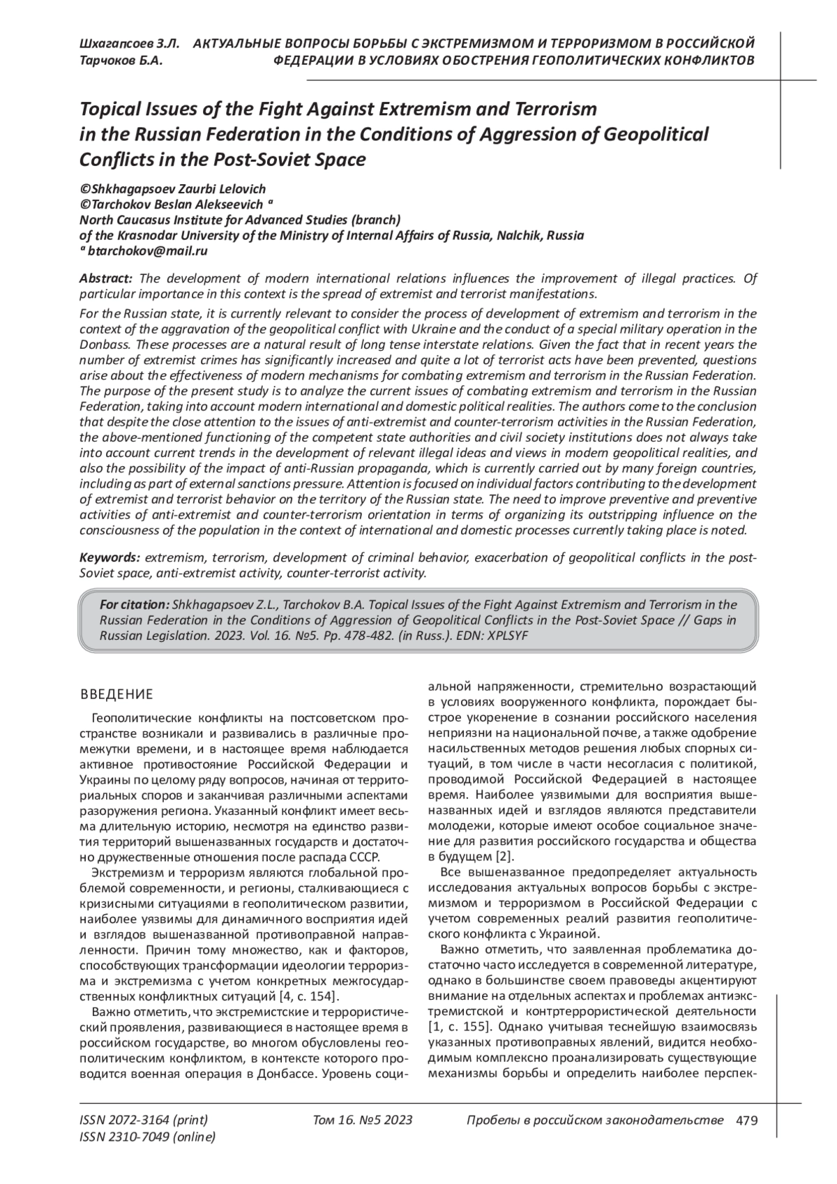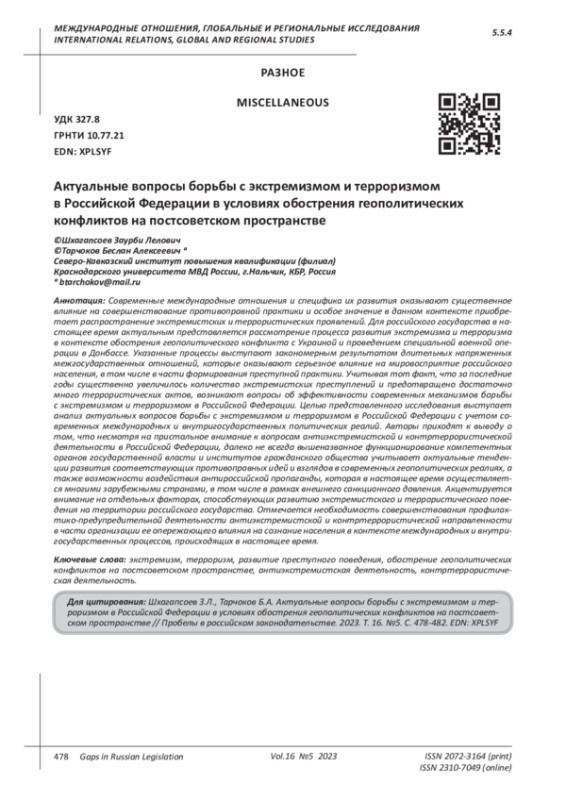 Современные международные отношения и специфика их развития оказывают существенное влияние на совершенствование противоправной практики и особое значение в данном контексте приобретает распространение экстремистских и террористических проявлений. Для российского государства в настоящее время актуальным представляется рассмотрение процесса развития экстремизма и терроризма в контексте обострения геополитического конфликта с Украиной и проведением специальной военной операции в Донбассе. Указанные процессы выступают закономерным результатом длительных напряженных межгосударственных отношений, которые оказывают серьезное влияние на мировосприятие российского населения, в том числе в части формирования преступной практики. Учитывая тот факт, что за последние годы существенно увеличилось количество экстремистских преступлений и предотвращено достаточно много террористических актов, возникают вопросы об эффективности современных механизмов борьбы с экстремизмом и терроризмом в Российской Федерации. Целью представленного исследования выступает анализ актуальных вопросов борьбы с экстремизмом и терроризмом в Российской Федерации с учетом современных международных и внутригосударственных политических реалий. Авторы приходят к выводу о том, что несмотря на пристальное внимание к вопросам антиэкстремистской и контртеррористической деятельности в Российской Федерации, далеко не всегда вышеназванное функционирование компетентных органов государственной власти и институтов гражданского общества учитывает актуальные тенденции развития соответствующих противоправных идей и взглядов в современных геополитических реалиях, а также возможности воздействия антироссийской пропаганды, которая в настоящее время осуществляется многими зарубежными странами, в том числе в рамках внешнего санкционного давления. Акцентируется внимание на отдельных факторах, способствующих развитию экстремистского и террористического поведения на территории российского государства. Отмечается необходимость совершенствования профилактико-предупредительной деятельности антиэкстремистской и контртеррористической направленности в части организации ее опережающего влияния на сознание населения в контексте международных и внутригосударственных процессов, происходящих в настоящее время.