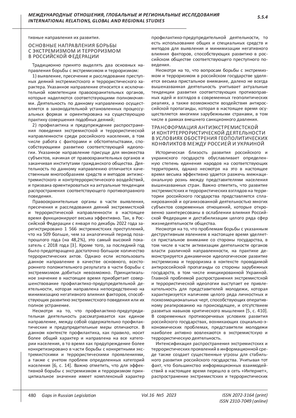 Правоохранительные органы в части выявления, пресечения и расследования деяний экстремистской и террористической направленности в настоящее время функционируют весьма эффективно. Так, в Российской Федерации с января по декабрь 2022 года зарегистрировано 1 566 экстремистских преступлений, что на 509 больше, чем за аналогичный период позапрошлого года (на 48,2%), это самый высокий показатель с 2018 года [3]. Кроме того, за последний год было предотвращено достаточно большое количество террористических актов. Однако если использовать данное направление в качестве основного, всестороннего положительного результата в части борьбы с экстремизмом добиться невозможно. Принципиальное значение в настоящее время приобретает совершенствование профилактико-предупредительной деятельности, которая направлена непосредственно на минимизацию негативного влияния факторов, способствующих развитию экстремистского поведения или их полное устранение.