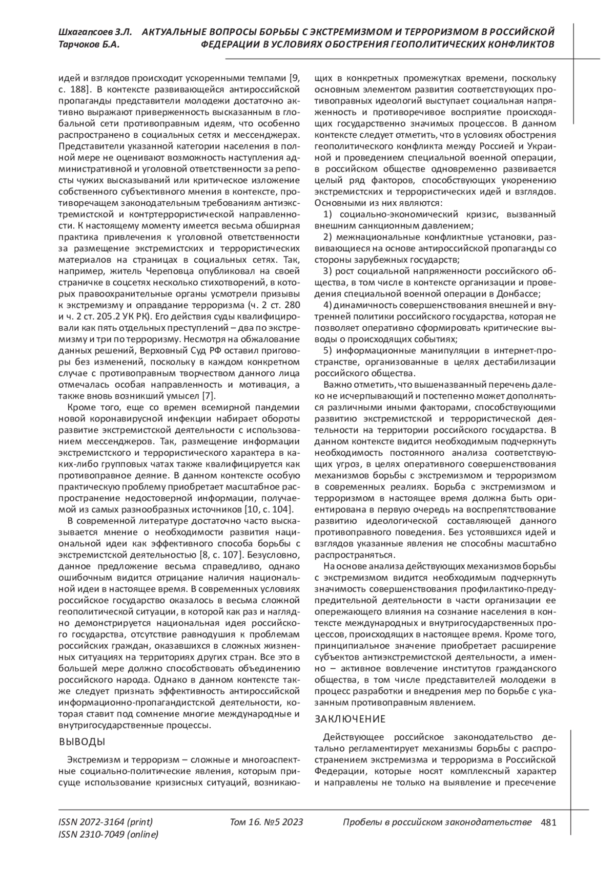Tarasov V.Yu. Prevention of the spread of ideas of extremism and terrorism on the Internet // Victimology. 2023. V. 10. No. 1. P. 101-106.