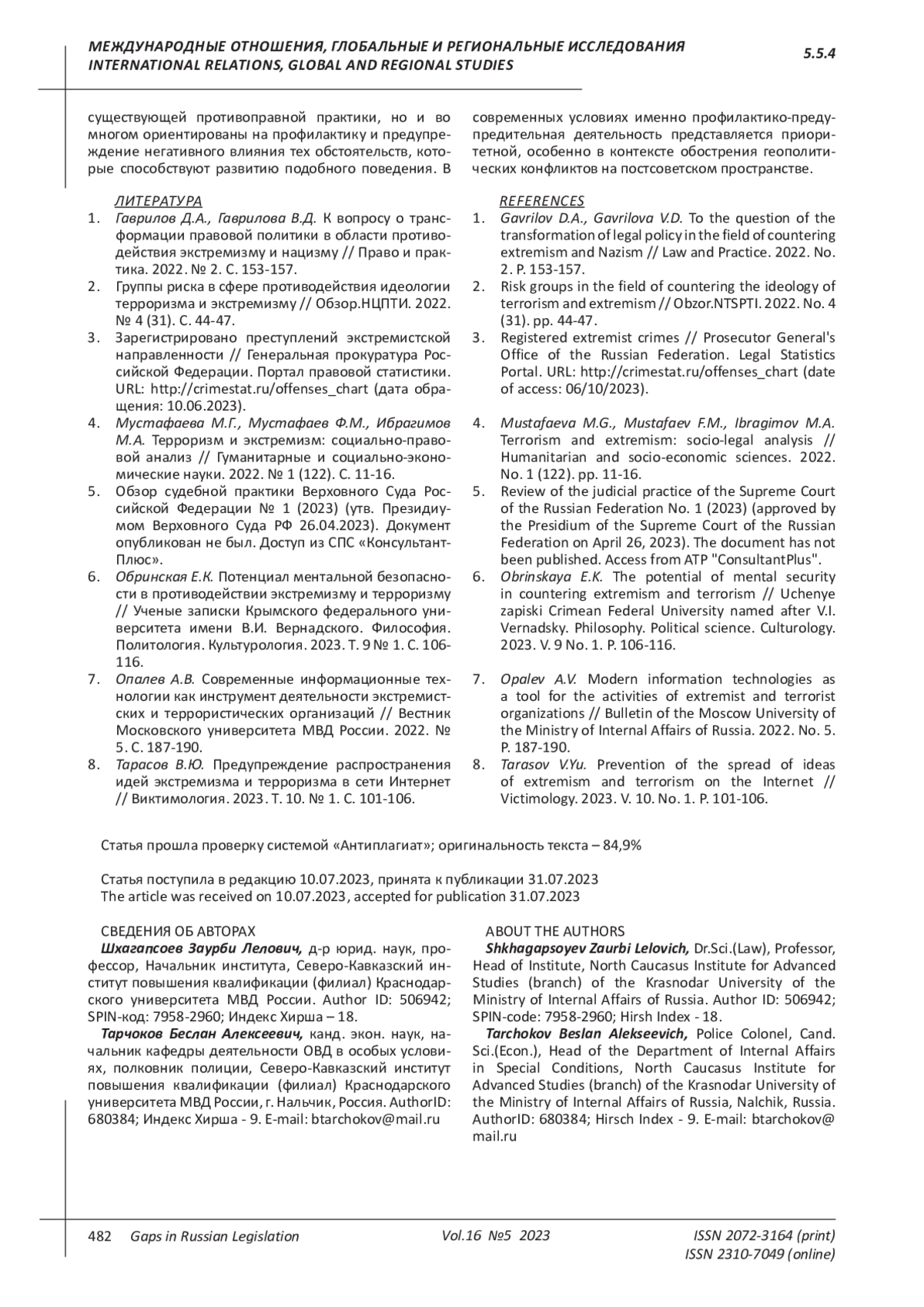 1. Гаврилов Д.А., Гаврилова В.Д. К вопросу о трансформации правовой политики в области противодействия экстремизму и нацизму // Право и практика. 2022. № 2. С. 153-157. EDN: XXNBGO