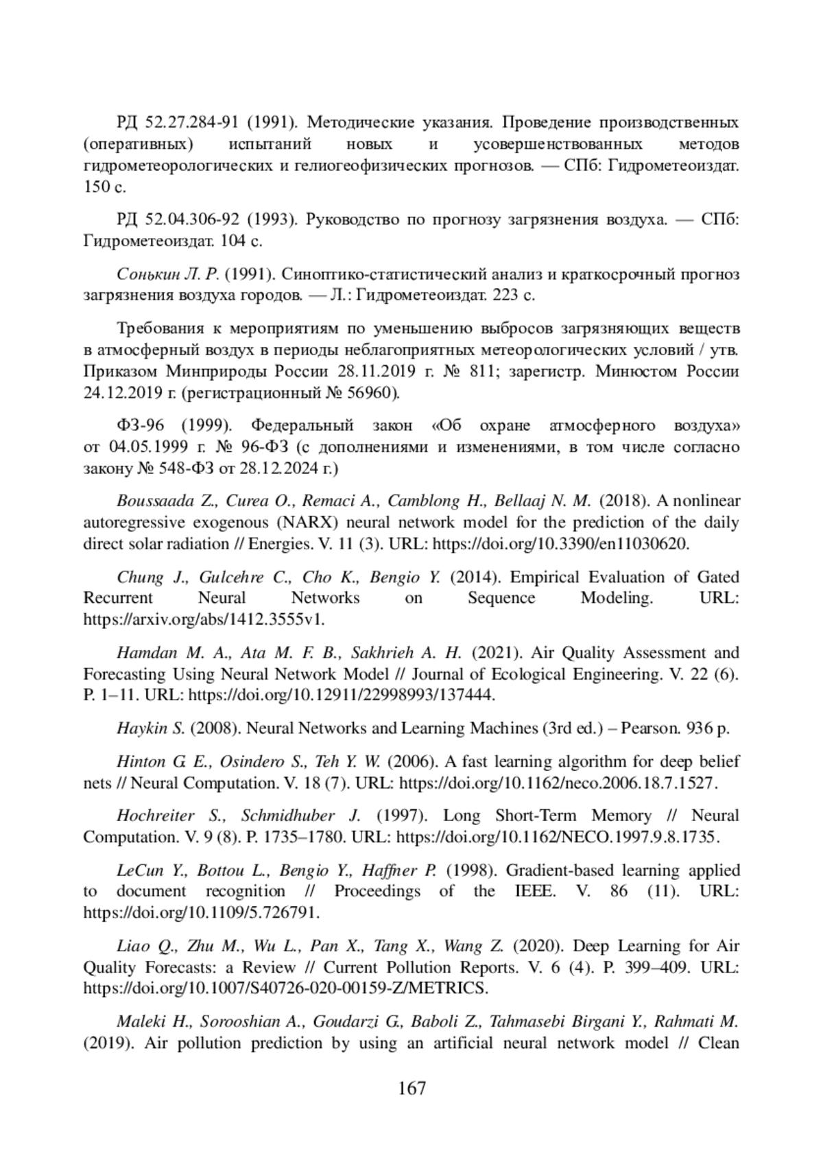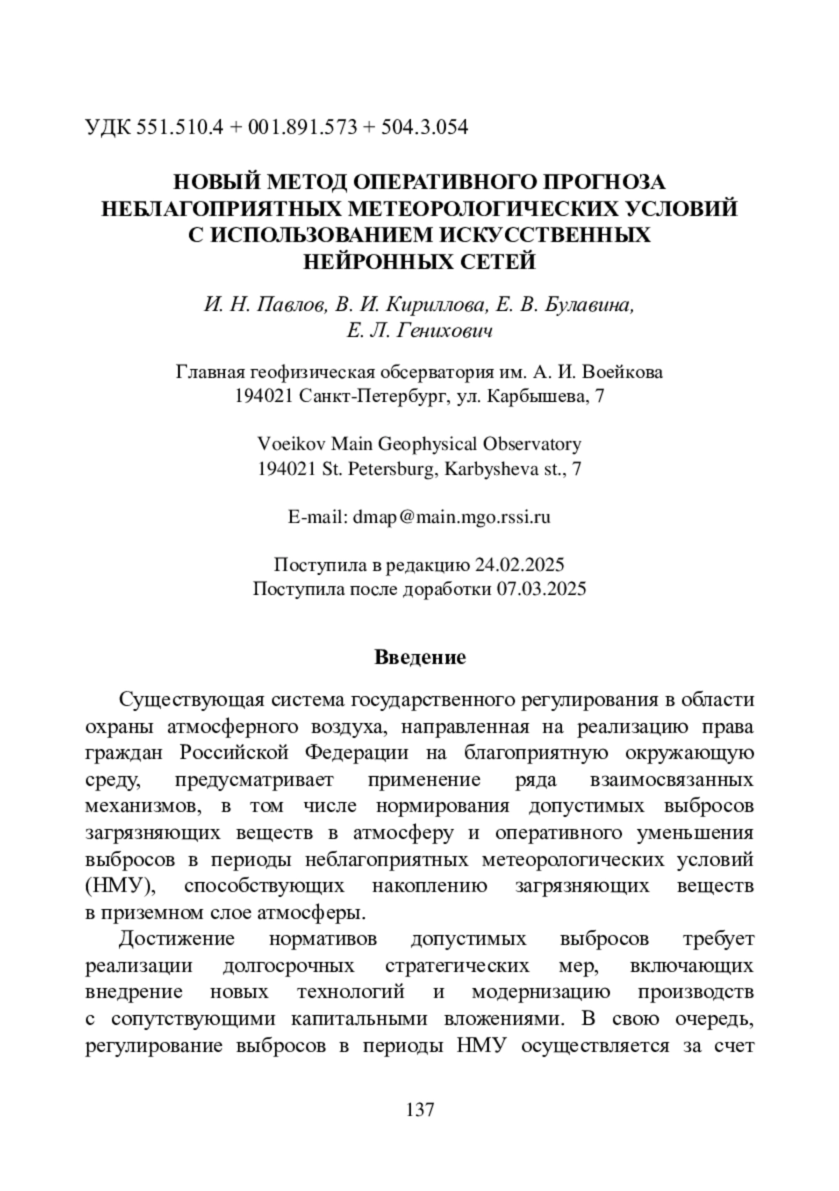 Предложен новый метод оперативного прогноза неблагоприятных метеорологических условий (НМУ) на основе искусственных нейронных сетей. Проведен сравнительный анализ трех подходов: пошаговой линейной регрессии с предварительной линеаризацией связей и синоптическим предиктором, а также многослойного перцептрона - с включением и без включения синоптического предиктора. Обучение и тестирование моделей проведено на данных девяти городов (суммарно более 35 лет наблюдений). Все подходы показали достаточную эффективность, при этом нейросетевые схемы обеспечили лучшую предупрежденность НМУ при меньшем числе ложных тревог. Результаты демонстрируют перспективность автоматизации учета крупномасштабных атмосферных процессов вместо традиционной ручной классификации синоптических ситуаций.