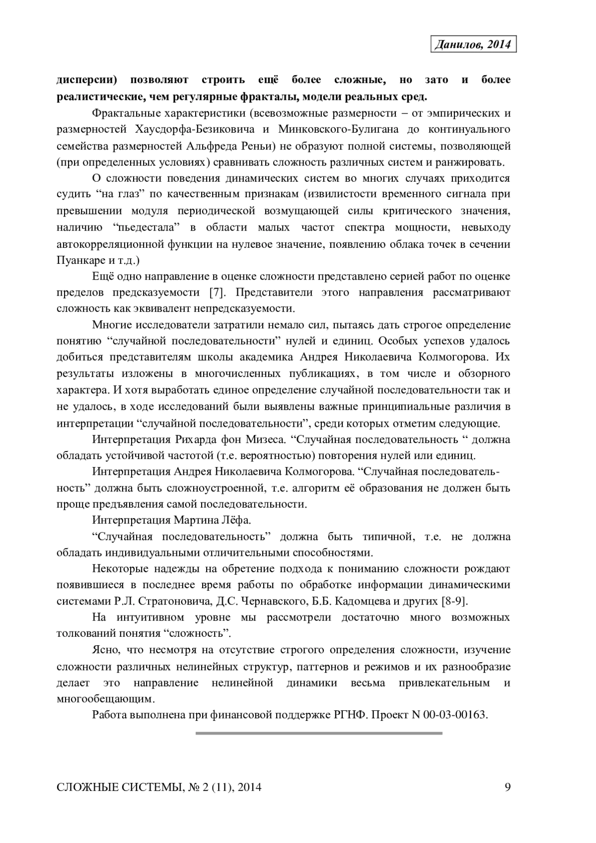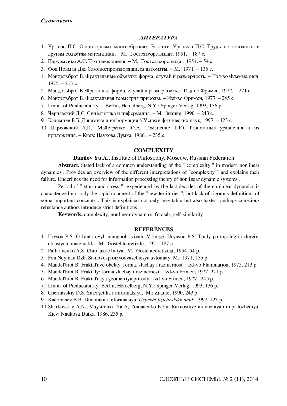 ДАНИЛОВ Ю. А. СЛОЖНОСТЬ // СЛОЖНЫЕ СИСТЕМЫ. 2014. №2 (11)