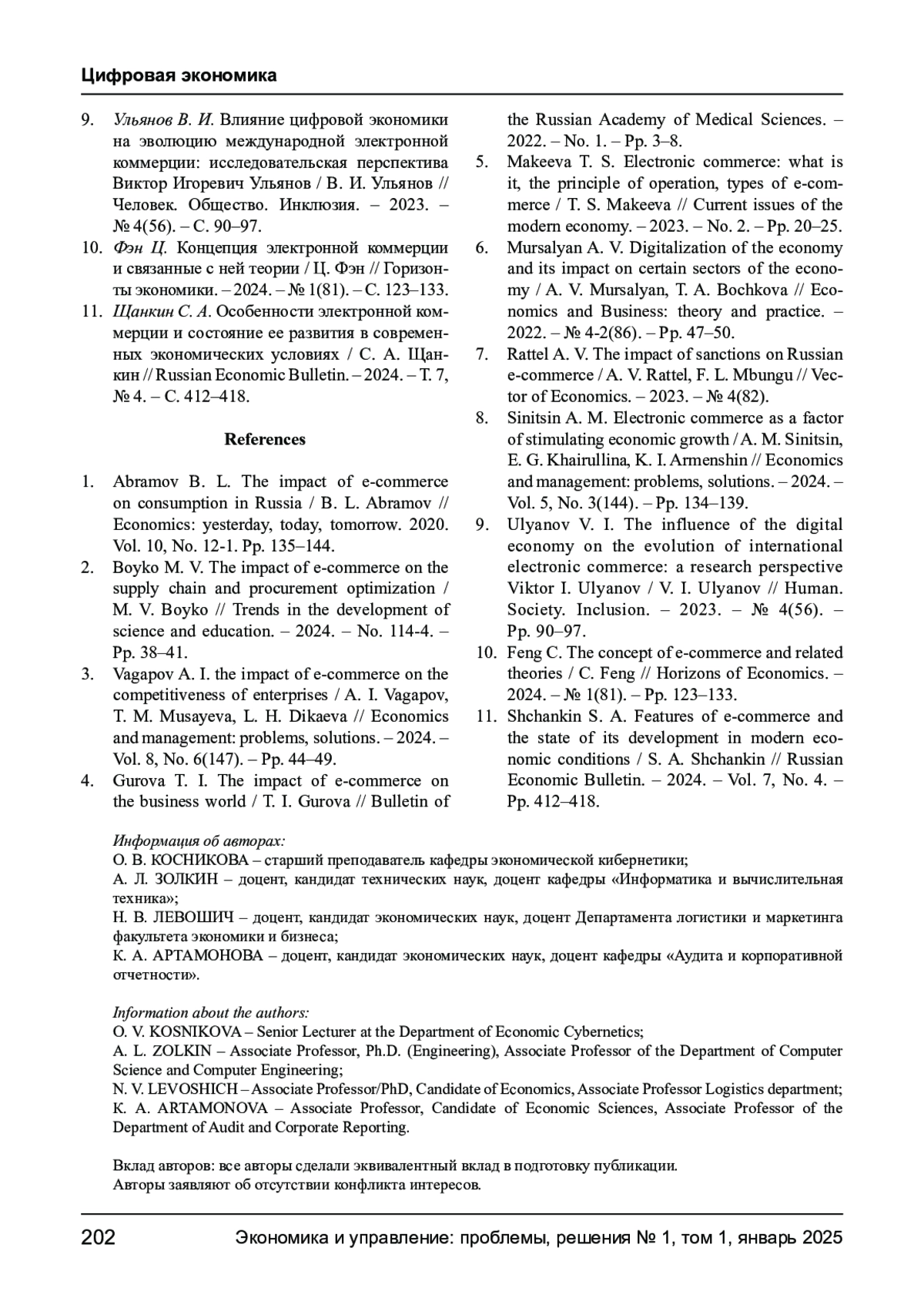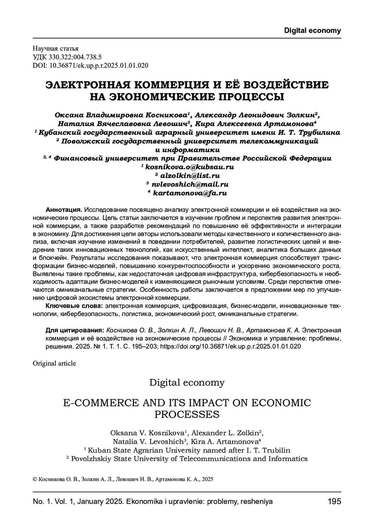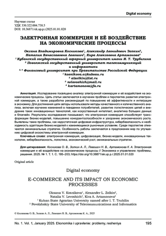 КОСНИКОВА О. В., ЗОЛКИН А. Л., ЛЕВОШИЧ Н. В., АРТАМОНОВА К. А. ЭЛЕКТРОННАЯ КОММЕРЦИЯ И ЕЁ ВОЗДЕЙСТВИЕ НА ЭКОНОМИЧЕСКИЕ ПРОЦЕССЫ // ЭКОНОМИКА И УПРАВЛЕНИЕ: ПРОБЛЕМЫ, РЕШЕНИЯ. 2025. ТОМ 1 № 1