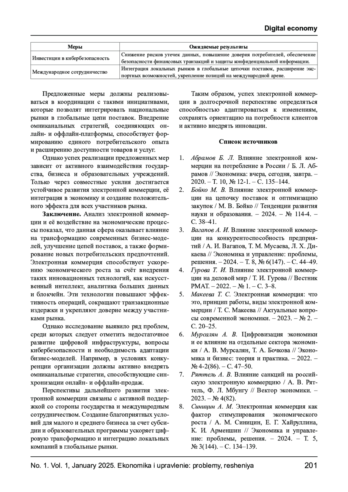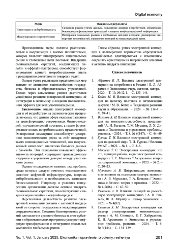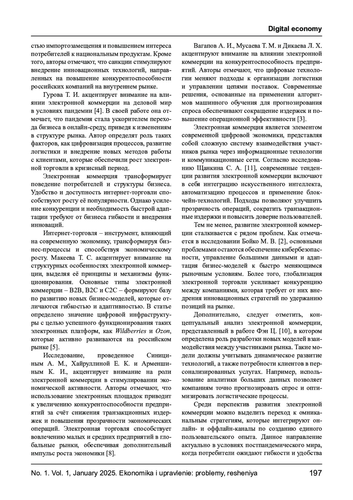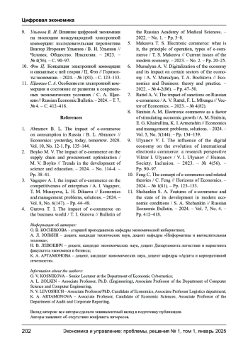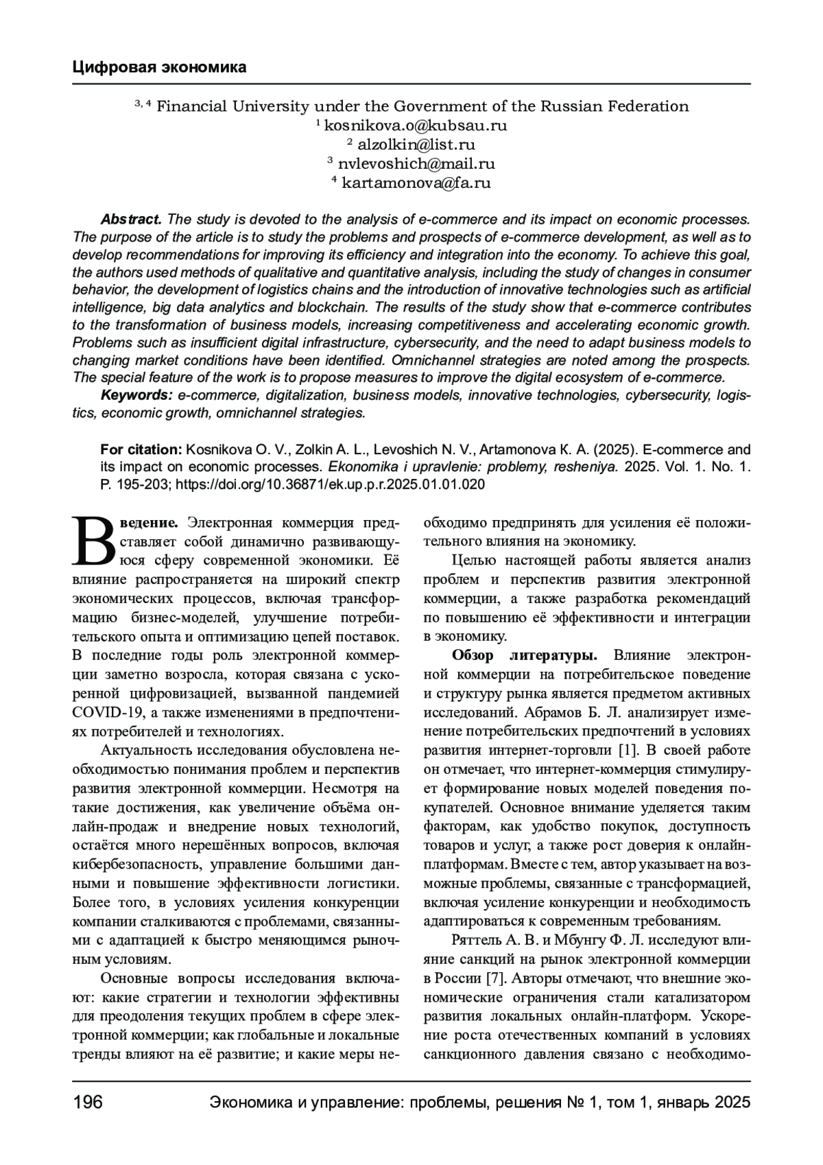 КОСНИКОВА О. В., ЗОЛКИН А. Л., ЛЕВОШИЧ Н. В., АРТАМОНОВА К. А. ЭЛЕКТРОННАЯ КОММЕРЦИЯ И ЕЁ ВОЗДЕЙСТВИЕ НА ЭКОНОМИЧЕСКИЕ ПРОЦЕССЫ // ЭКОНОМИКА И УПРАВЛЕНИЕ: ПРОБЛЕМЫ, РЕШЕНИЯ. 2025. ТОМ 1 № 1