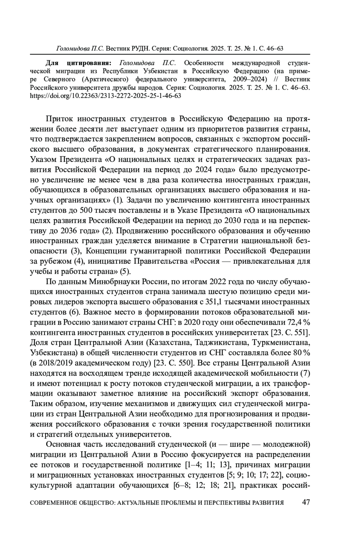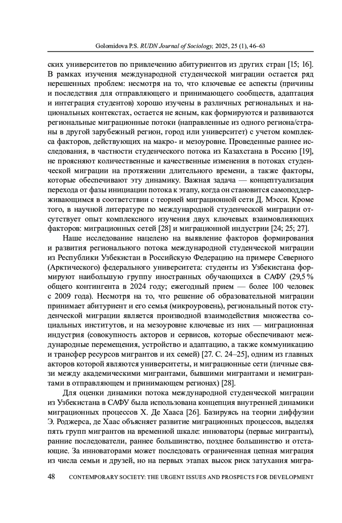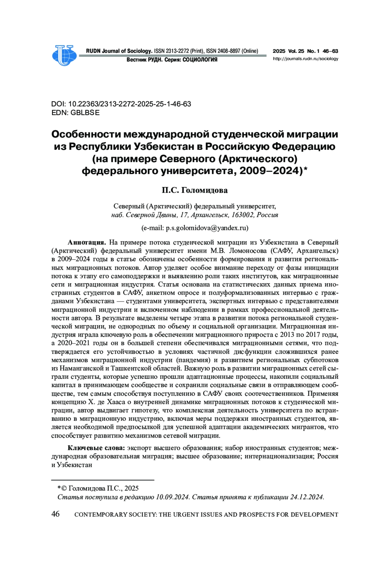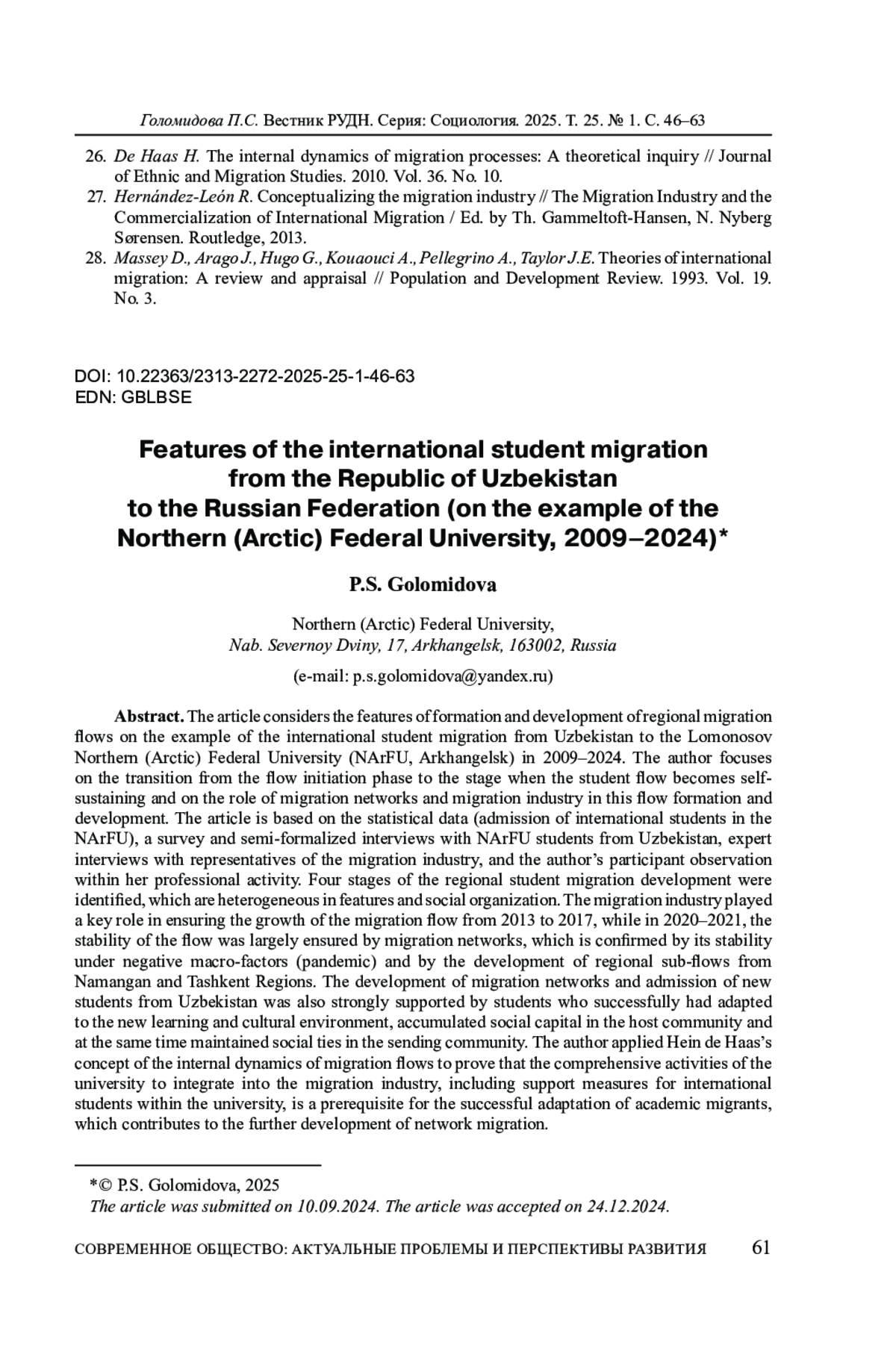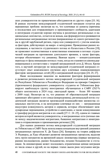 На примере потока студенческой миграции из Узбекистана в Северный (Арктический) федеральный университет имени М. В. Ломоносова (САФУ, Архангельск) в 2009-2024 годы в статье обозначены особенности формирования и развития региональных миграционных потоков. Автор уделяет особое внимание переходу от фазы инициации потока к этапу его самоподдержки и выявлению роли таких институтов, как миграционные сети и миграционная индустрия. Статья основана на статистических данных приема иностранных студентов в САФУ, анкетном опросе и полуформализованных интервью с гражданами Узбекистана - студентами университета, экспертных интервью с представителями миграционной индустрии и включенном наблюдении в рамках профессиональной деятельности автора. В результате выделены четыре этапа в развитии потока региональной студенческой миграции, не однородных по объему и социальной организации. Миграционная индустрия играла ключевую роль в обеспечении миграционного прироста с 2013 по 2017 годы, а 2020-2021 годы он в большей степени обеспечивался миграционными сетями, что подтверждается его устойчивостью в условиях частичной дисфункции сложившихся ранее механизмов миграционной индустрии (пандемия) и развитием региональных субпотоков из Наманганской и Ташкентской областей. Важную роль в развитии миграционных сетей сыграли студенты, которые успешно прошли адаптационные процессы, накопили социальный капитал в принимающем сообществе и сохранили социальные связи в отправляющем сообществе, тем самым способствуя поступлению в САФУ своих соотечественников. Применяя концепцию Х. де Хааса о внутренней динамике миграционных потоков к студенческой миграции, автор выдвигает гипотезу, что комплексная деятельность университета по встраиванию в миграционную индустрию, включая меры поддержки иностранных студентов, является необходимой предпосылкой для успешной адаптации академических мигрантов, что способствует развитию механизмов сетевой миграции.