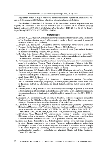 6. Габдрахманова Г.Ф., Сагдиева Э.А., Оморова Н.И. Учебная миграция в Республике Татарстан: адаптация и интеграция студентов из государств Центральной Азии. Казань, 2014. EDN: YMMZAB