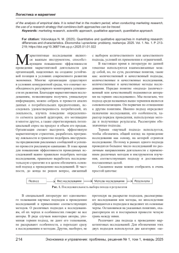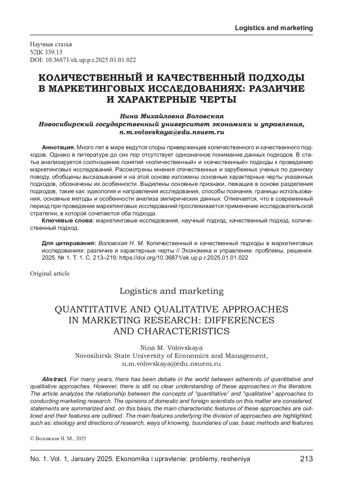 Много лет в мире ведутся споры приверженцев количественного и качественного подходов. Однако в литературе до сих пор отсутствует однозначное понимание данных подходов. В статье анализируется соотношение понятий «количественный» и «качественный» подходы к проведению маркетинговых исследований. Рассмотрены мнения отечественных и зарубежных ученых по данному поводу, обобщены высказывания и на этой основе изложены основные характерные черты указанных подходов, обозначены их особенности. Выделены основные признаки, лежащие в основе разделения подходов, такие как: идеология и направления исследования, способы познания, границы использования, основные методы и особенности анализа эмпирических данных. Отмечается, что в современный период при проведении маркетинговых исследований прослеживается применение исследовательской стратегии, в которой сочетаются оба подхода.