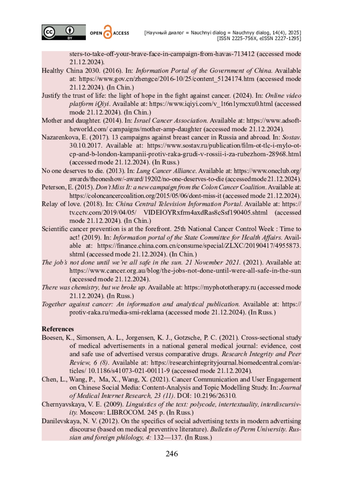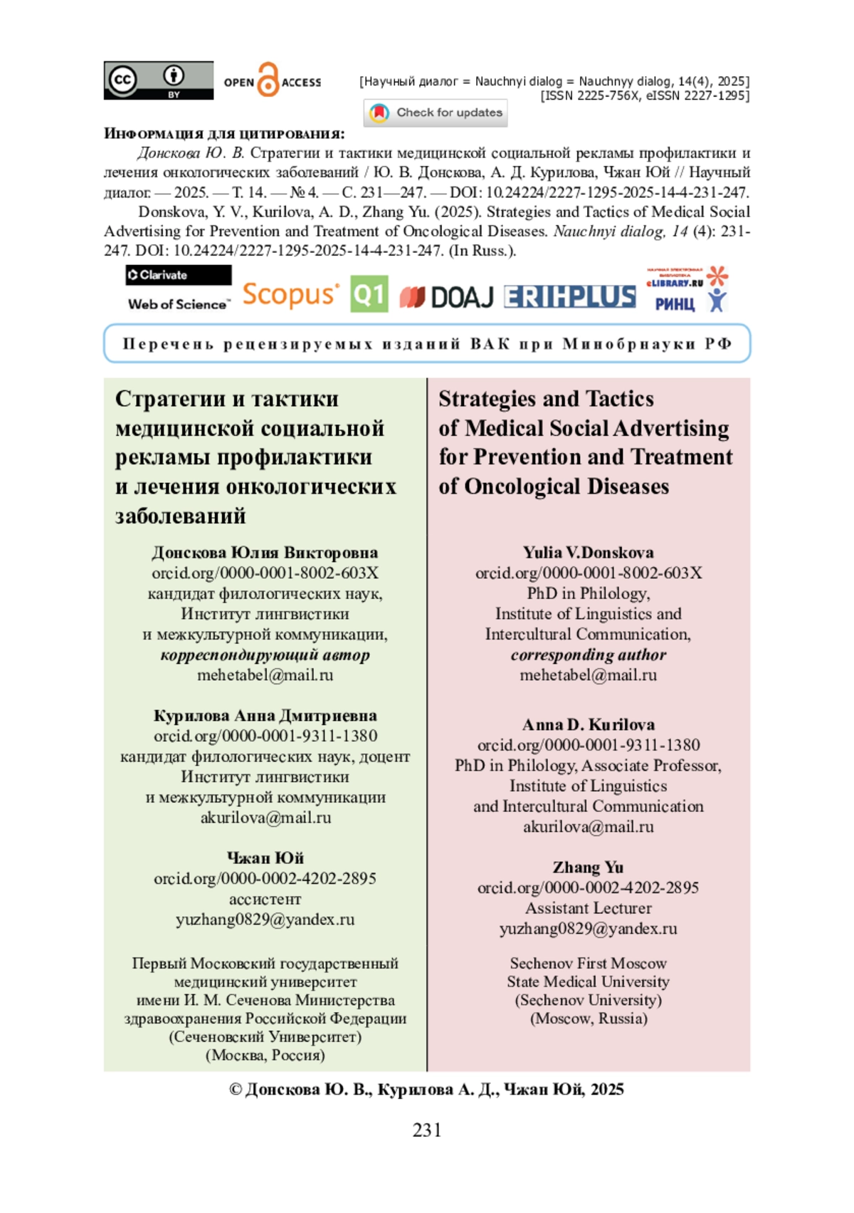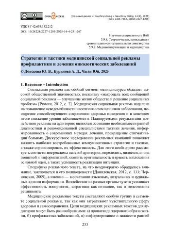 ДОНСКОВА Ю. В., КУРИЛОВА А. Д., ЧЖАН Ю. СТРАТЕГИИ И ТАКТИКИ МЕДИЦИНСКОЙ СОЦИАЛЬНОЙ РЕКЛАМЫ ПРОФИЛАКТИКИ И ЛЕЧЕНИЯ ОНКОЛОГИЧЕСКИХ ЗАБОЛЕВАНИЙ // НАУЧНЫЙ ДИАЛОГ. 2025. ТОМ 14, № 4