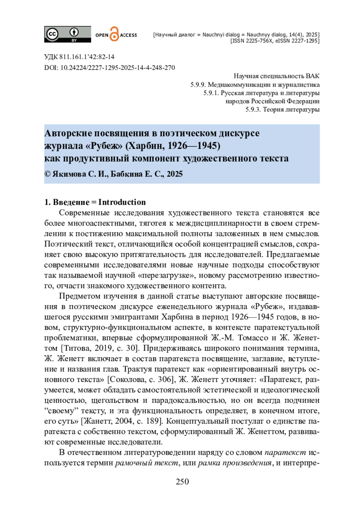 Изучаются особенности поэтического контента еженедельного литературно-художественного издания русских эмигрантов в Китае, журнала «Рубеж» (1926—1945), в новом, структурно-функциональном аспекте, в контексте паратекстуальной проблематики, сформулированной Ж.-М. Томассо и Ж. Женеттом. Материалом послужила богатая подборка журнала «Рубеж», хранящаяся в Государственном архиве Хабаровского края. Была произведена жанровая выборка поэтических текстов с авторскими посвящениями. Авторы статьи рассматривают внутрижанровую типологию и полифункциональность авторских посвящений как одного из важных элементов паратекста в произведениях поэтов-эмигрантов. Проведенный контент-анализ мемориальных и диалоговых авторских посвящений выявляет многообразие их текстологических возможностей. Установлено, что посвящения являются, с одной стороны, формой авторского присутствия и самовыражения, а с другой — разновидностью интертекста. Дискурсивный анализ авторских посвящений в произведениях поэтов-эмигрантов выявляет философско-эстетическую, духовно-нравственную обусловленность авторского творческого самовыражения, его соответствия высокому запросу русской эмигрантской аудитории на актуализацию ценностей русской национальной духовной культуры и искусства (литература, изобразительное искусство, балет), значимый вклад художников-эмигрантов в формирование Русского мира.