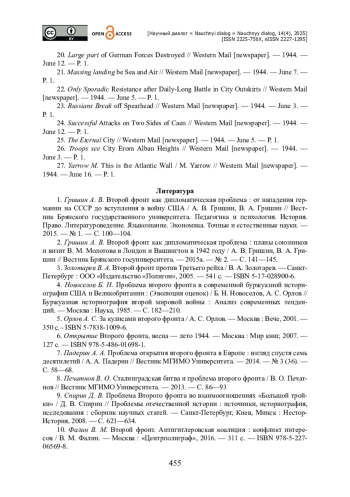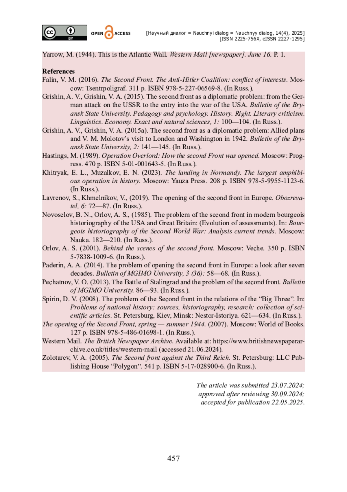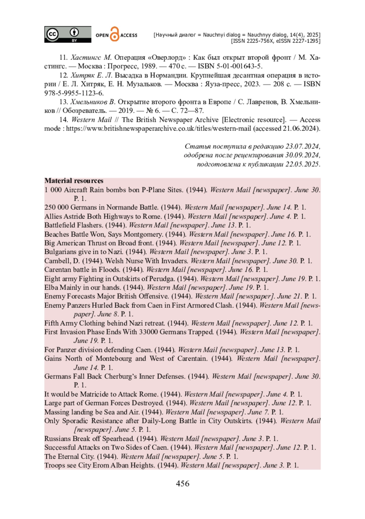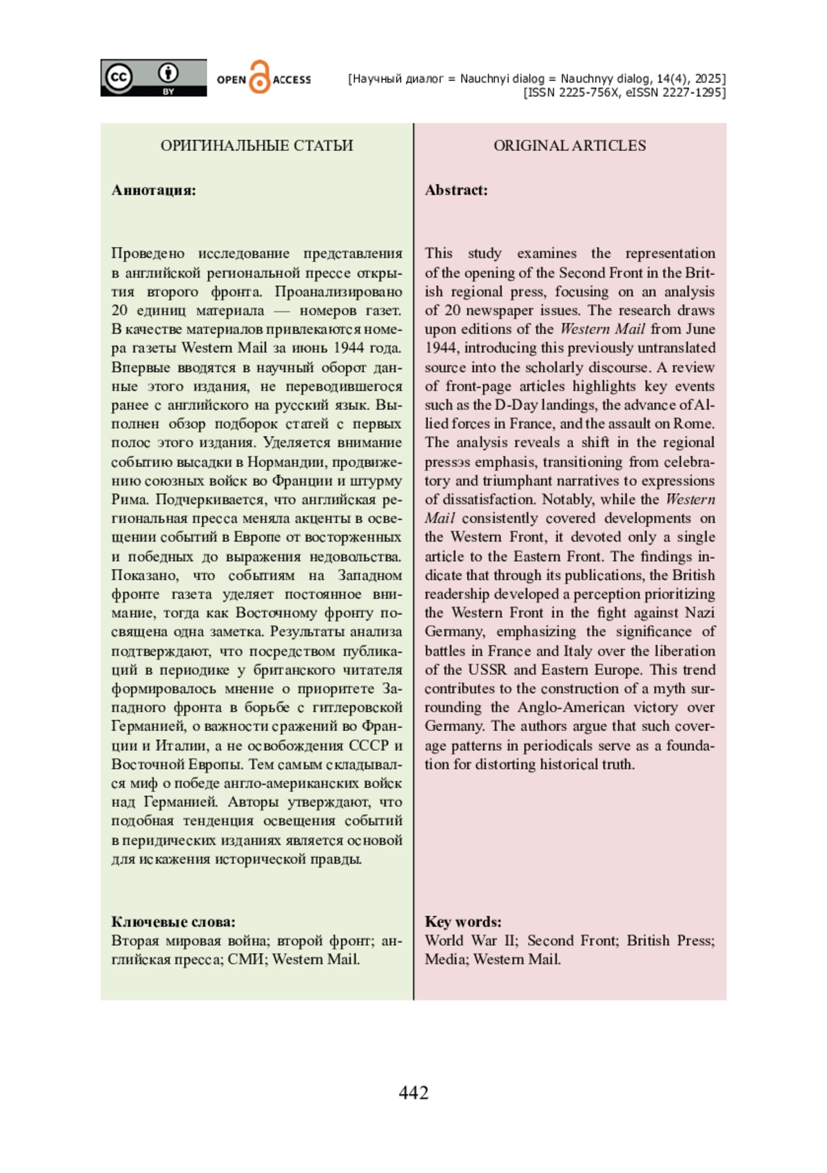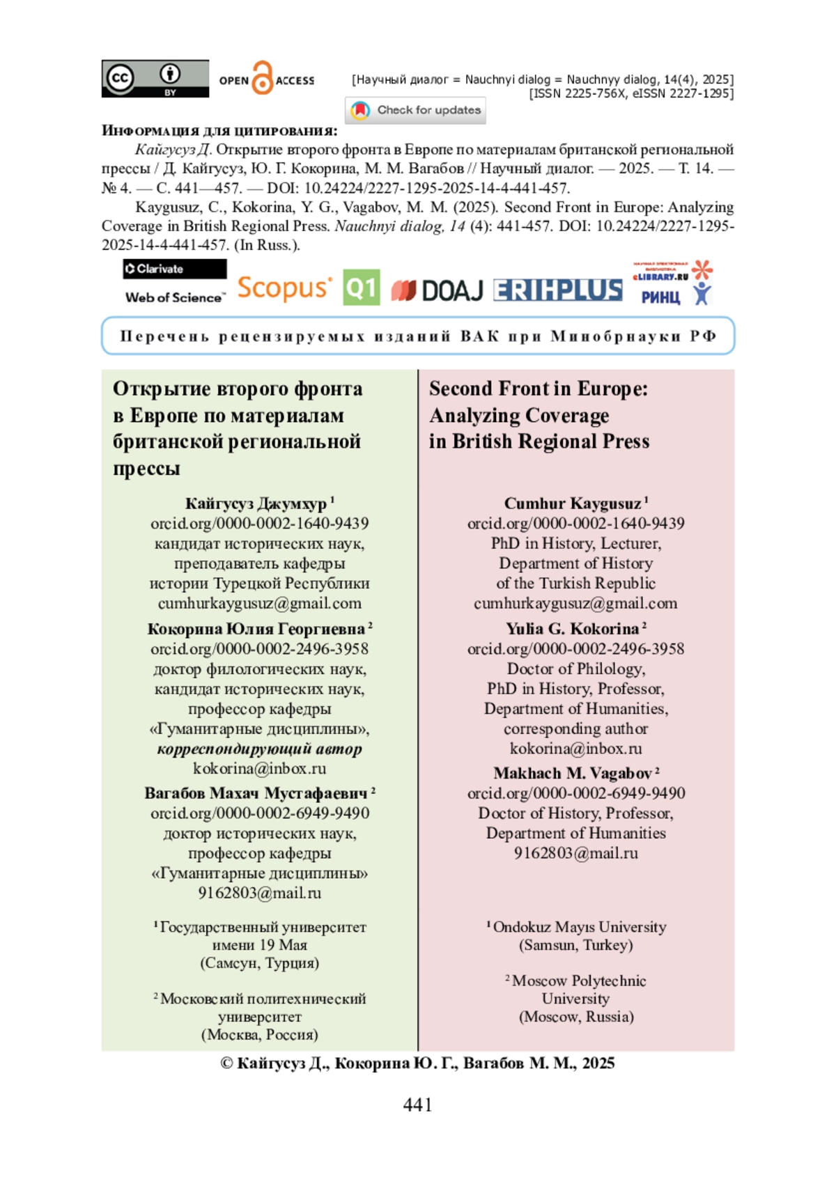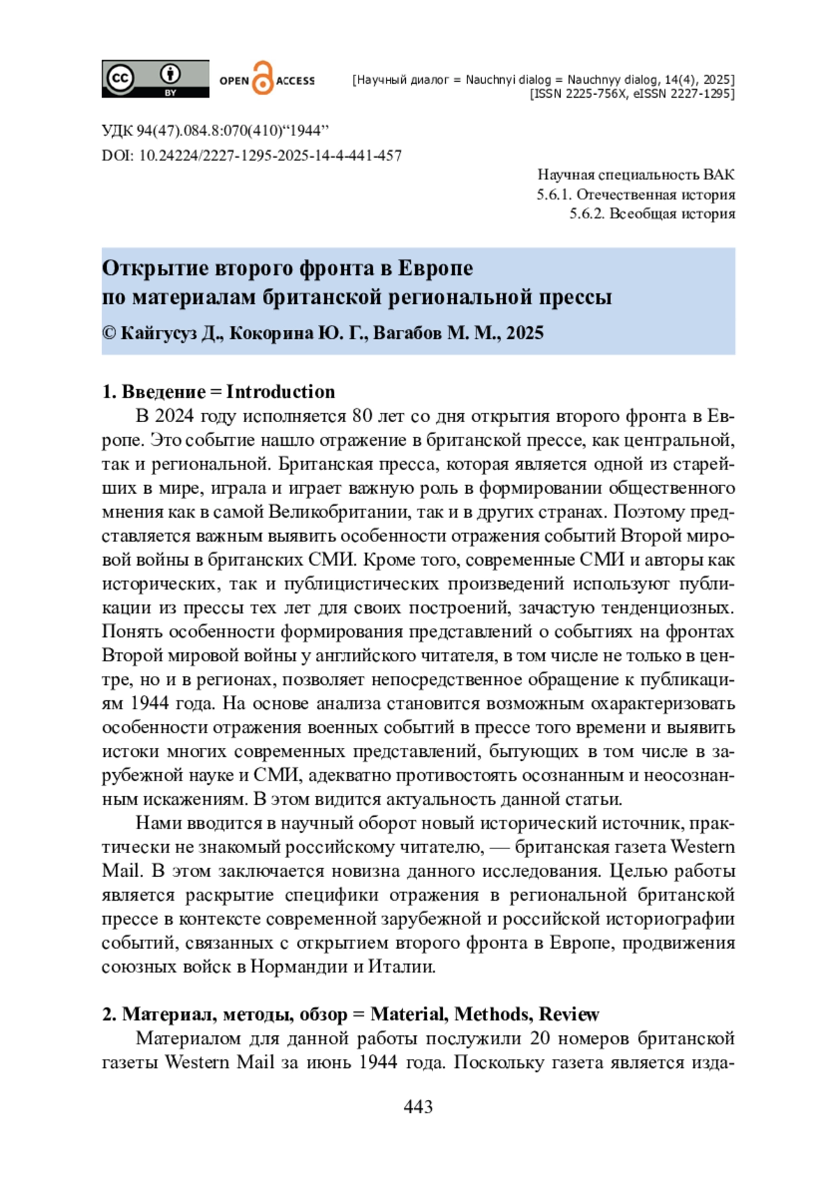 КАЙГУСУЗ Д., КОКОРИНА Ю. Г., ВАГАБОВ М. М. ОТКРЫТИЕ ВТОРОГО ФРОНТА В ЕВРОПЕ ПО МАТЕРИАЛАМ БРИТАНСКОЙ РЕГИОНАЛЬНОЙ ПРЕССЫ // НАУЧНЫЙ ДИАЛОГ. 2025. ТОМ 14, № 4