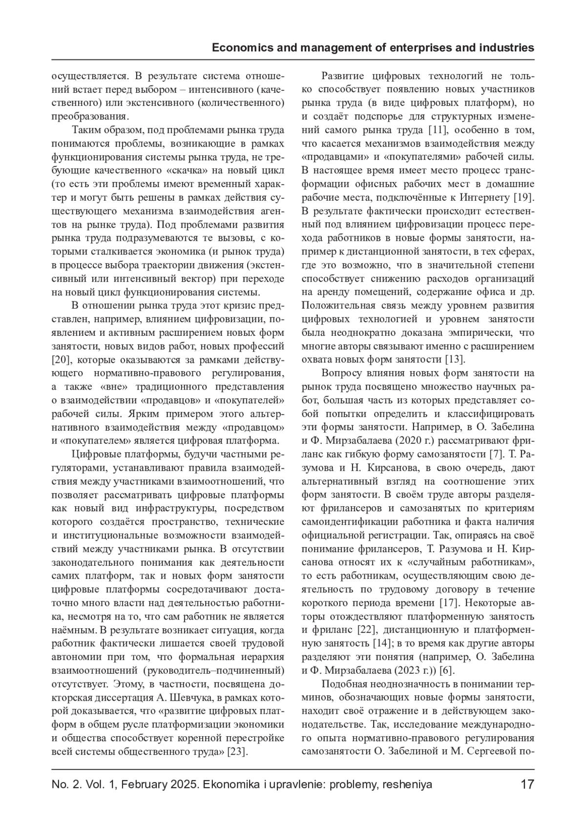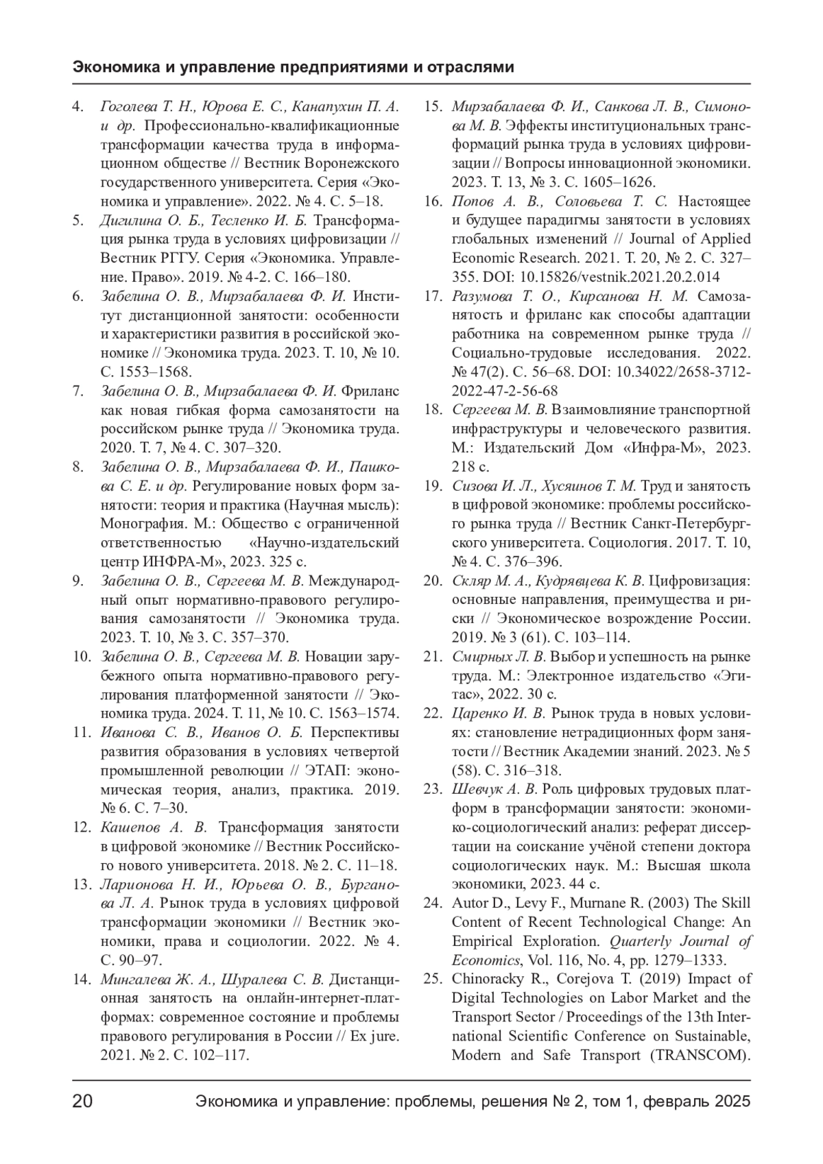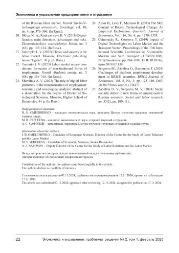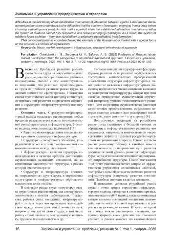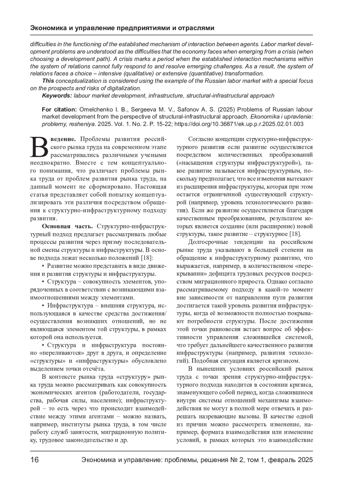 ОМЕЛЬЧЕНКО И. Б., СЕРГЕЕВА М. В., САФОНОВ А. С. ПРОБЛЕМЫ РАЗВИТИЯ РОССИЙСКОГО РЫНКА ТРУДА С ПОЗИЦИИ СТРУКТУРНО-ИНФРАСТРУКТУРНОГО ПОДХОДА // ЭКОНОМИКА И УПРАВЛЕНИЕ: ПРОБЛЕМЫ, РЕШЕНИЯ. 2025. ТОМ 1 № 2