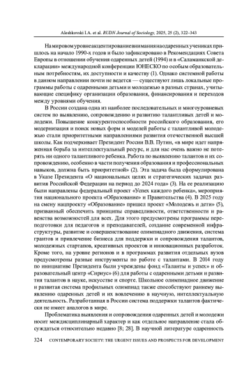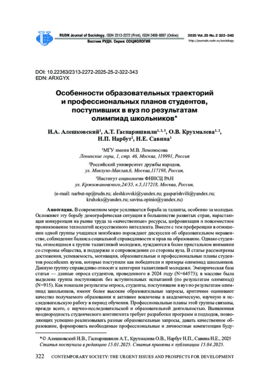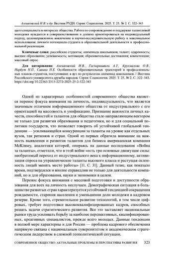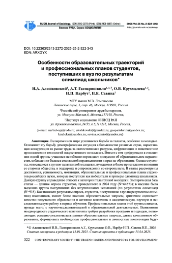 В современном мире усиливается борьба за таланты, особенно за молодые. Осложняет эту борьбу демографическая ситуация в большинстве развитых стран, нарастающая конкуренция на рынке труда за «качественные» ресурсы, цифровизация и повсеместное проникновение технологий искусственного интеллекта. Вместе с тем преференции в отношении одной группы учащихся неизбежно порождают дискуссии об образовательном неравенстве, соблюдении баланса социальной справедливости и прав на образование. Однако студенты, относящиеся к группе талантливой молодежи, нуждаются в более пристальном внимании со стороны общества, в поддержке и сопровождении со стороны вуза. В статье рассмотрены достижения, успеваемость, мотивация, образовательные и профессиональные планы студентов российских вузов, которые поступили как победители и призеры олимпиад школьников. Данную группу справедливо относят к категории талантливой молодежи. Эмпирическая база статьи - данные опроса студентов, проведенного в 2024 году (N=64573); в массиве была выделена группа поступивших без вступительных испытаний (по результатам олимпиад) (N=915). Как показали результаты опроса, студенты, поступившие в вуз по результатам олимпиад школьников, имеют более высокие образовательные запросы, критичнее оценивают качество получаемого образования и активнее вовлечены в академическую, научную и исследовательскую работу в период обучения. Профессиональные планы этой группы связаны, прежде всего, с научно-исследовательской и образовательной деятельностью. Выявленная неоднородность студенческого контингента требует разработки программ и подходов, позволяющих успешно реализовывать разные образовательные запросы, давать качественное образование, формировать необходимые профессиональные и личностные компетенции будущего специалиста в интересах общества. Работа по сопровождению и поддержке талантливой молодежи нуждается в совершенствовании и должна ориентироваться на индивидуальный подход, целенаправленное вовлечение в научно-исследовательскую работу и максимальное использование личного потенциала студента в образовательной деятельности и профессиональной реализации.
