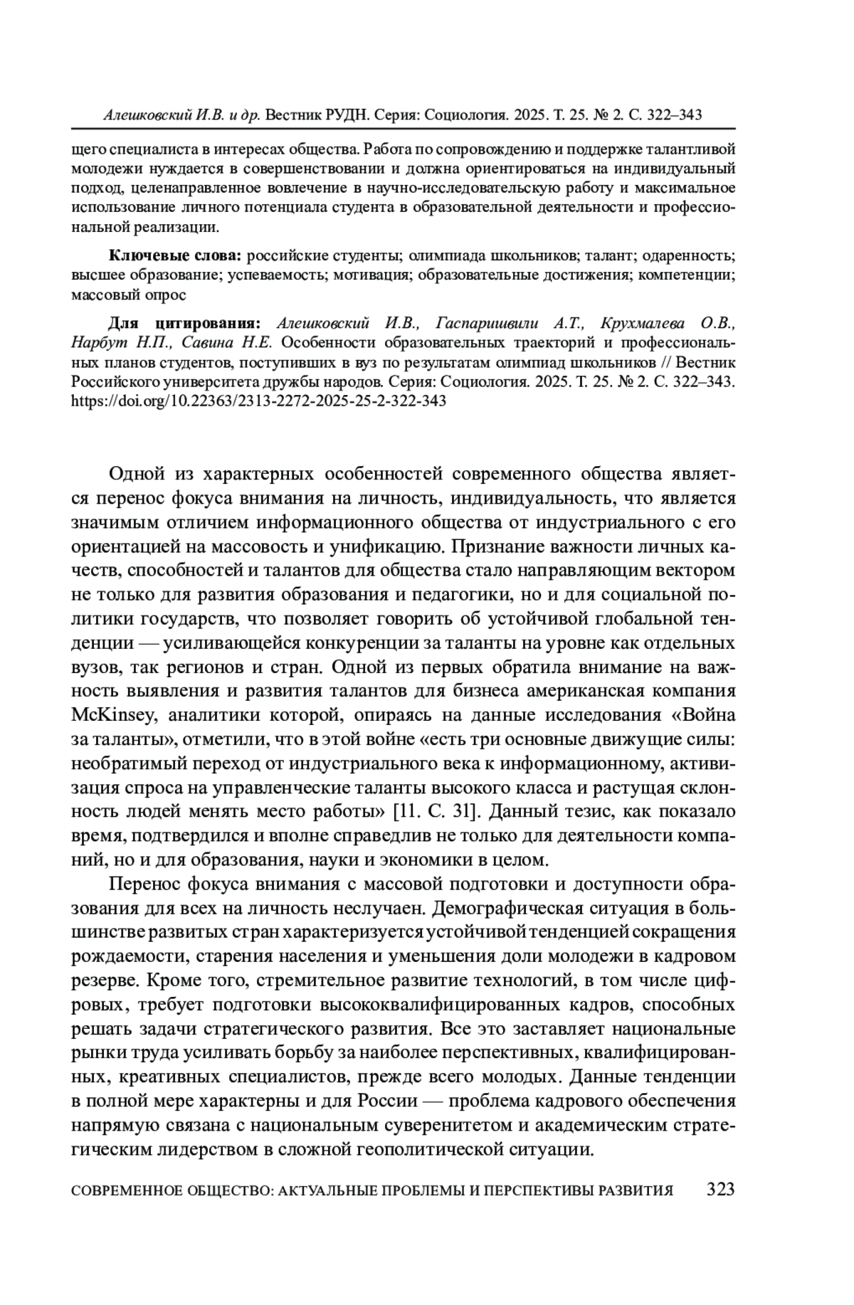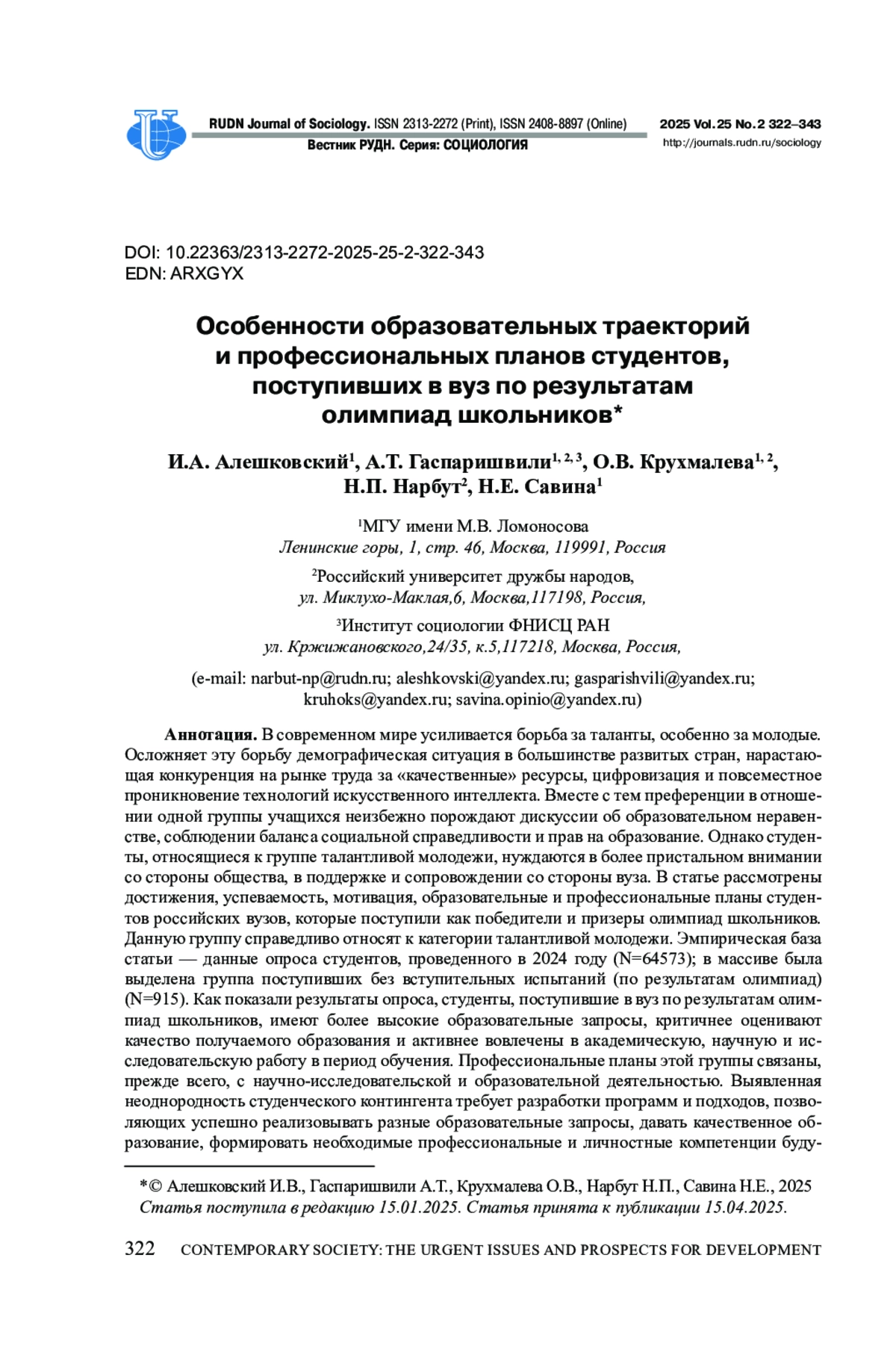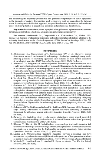 1. Алешковский И.А., Гаспаришвили А.Т., Крухмалева О.В., Нарбут Н.П., Савина Н.Е. Стартовые позиции абитуриентов вузов и особенности их дальнейшего обучения: социологический анализ // Вестник РУДН. Серия: Социология. 2022. Т. 22. № 3.