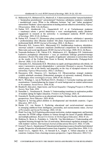 12. Малиновский С.С., Шибанова Е.Ю., Маслова Е.А. В чем разница между “самыми лучшими” и “достаточно престижными” университетами? Карьерные ожидания студентов ведущих и неселективных вузов // Вопросы образования. 2024. Т. 3. № 2.