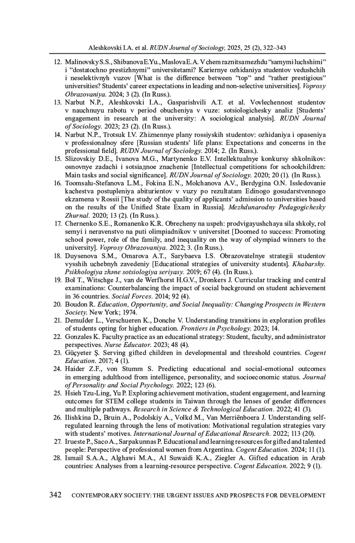 13. Нарбут Н.П., Алешковский И.А., Гаспаришвили А.Т. и др. Вовлеченность студентов в научную работу в период обучения в вузе: социологический анализ // Вестник РУДН. Серия: Социология. 2023. Т. 23. № 2.