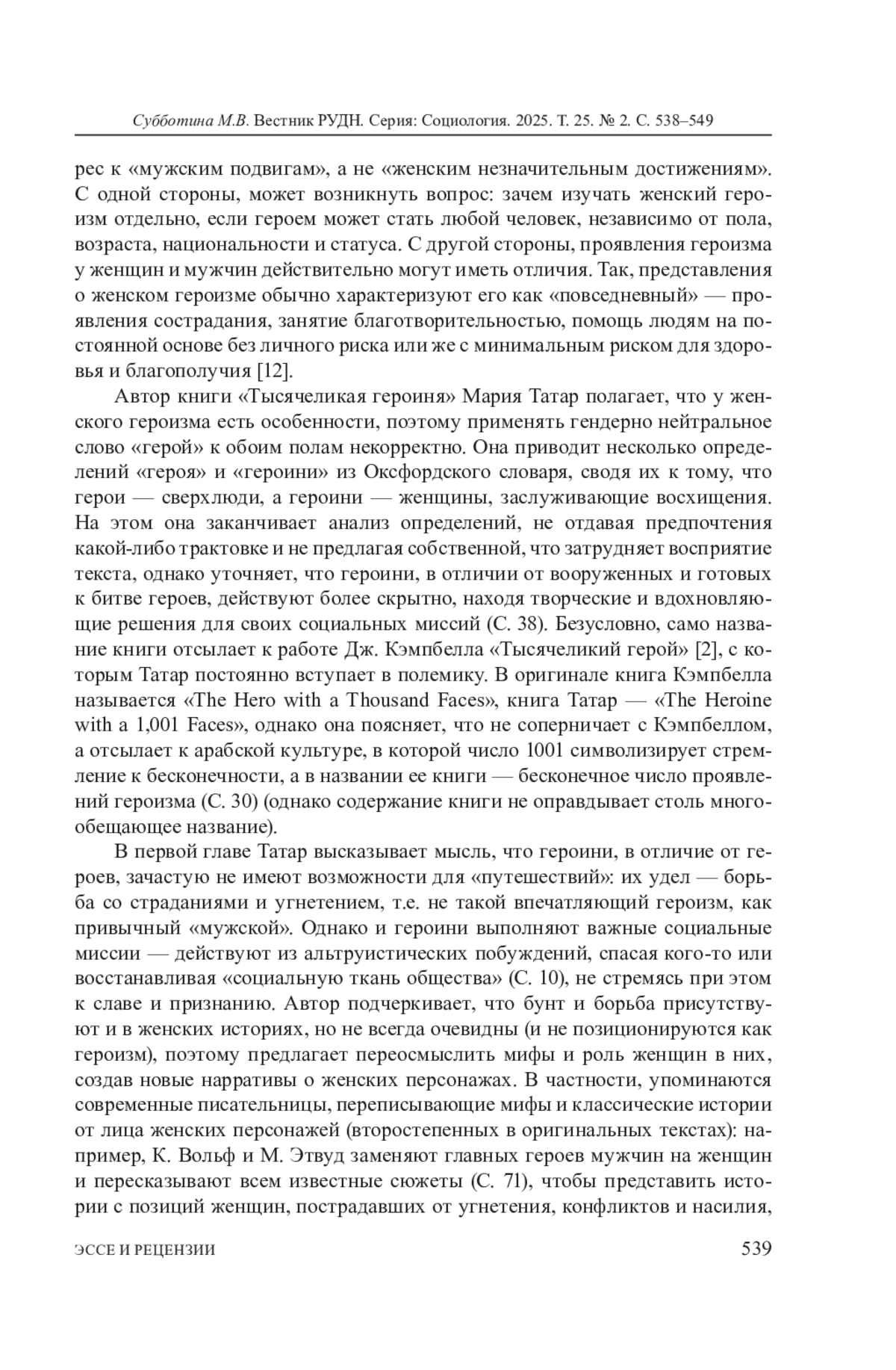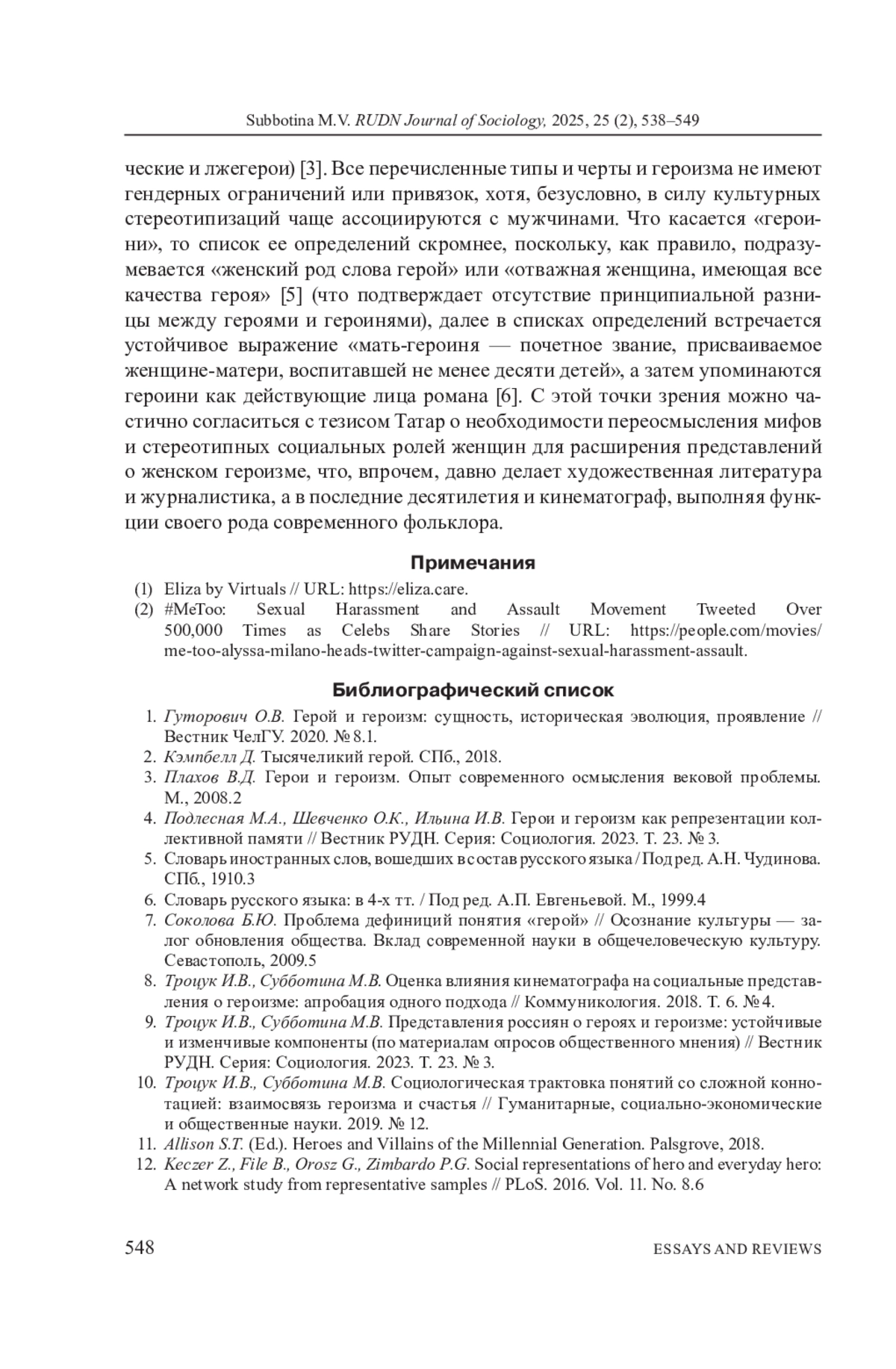 9. Троцук И.В., Субботина М.В. Представления россиян о героях и героизме: устойчивые и изменчивые компоненты (по материалам опросов общественного мнения) // Вестник РУДН. Серия: Социология. 2023. Т. 23. № 3.