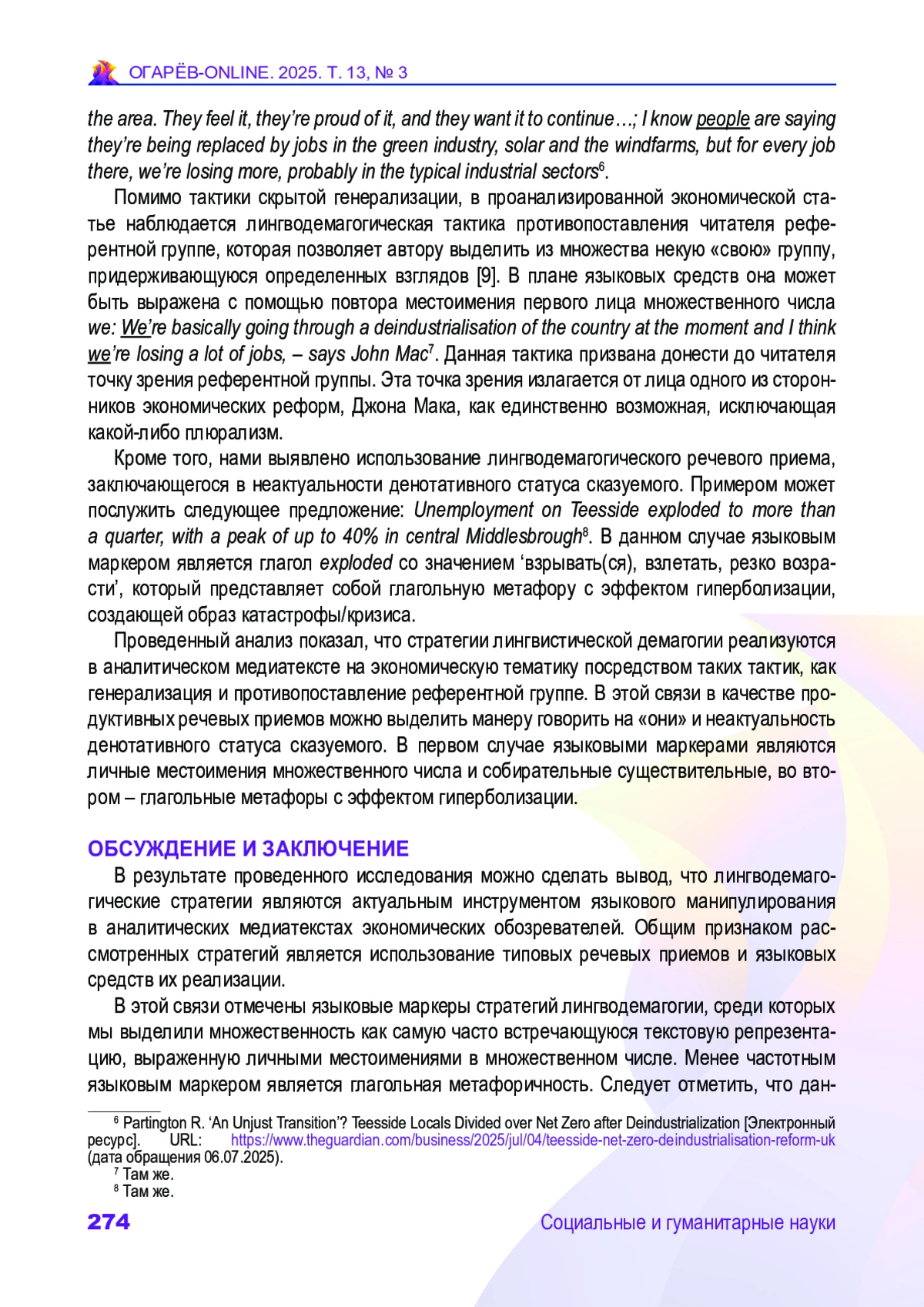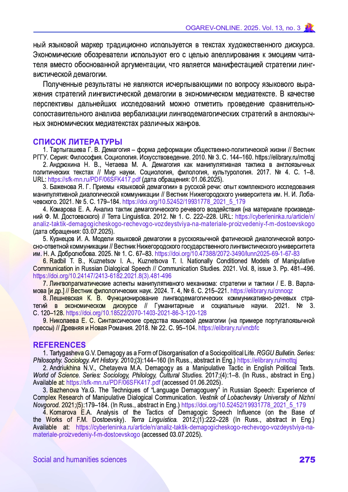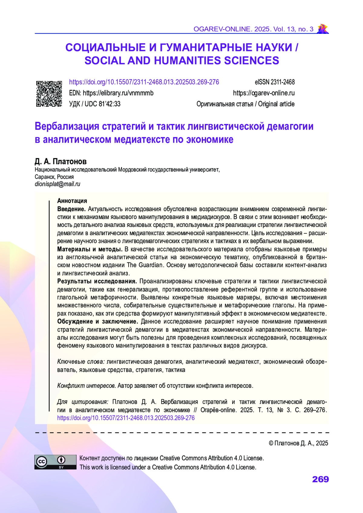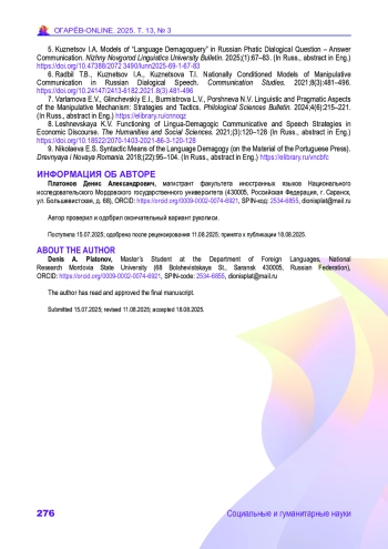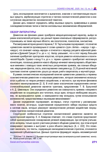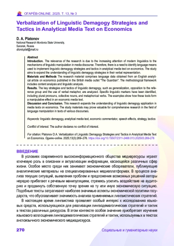ПЛАТОНОВ Д. А. ВЕРБАЛИЗАЦИЯ СТРАТЕГИЙ И ТАКТИК ЛИНГВИСТИЧЕСКОЙ ДЕМАГОГИИ В АНАЛИТИЧЕСКОМ МЕДИАТЕКСТЕ ПО ЭКОНОМИКЕ // ОГАРЁВ-ONLINE. 2025. № 3 (220), ТОМ 13
