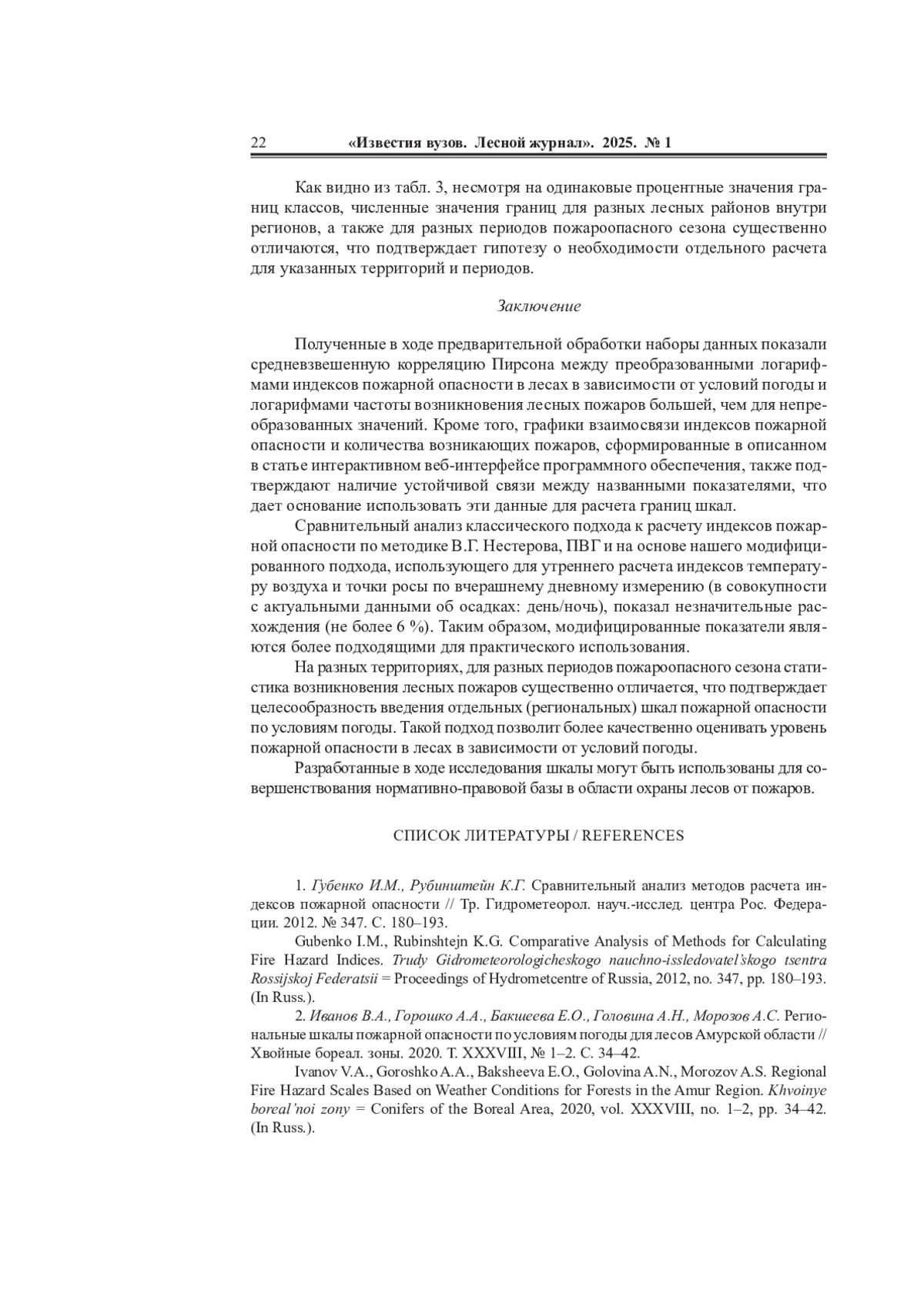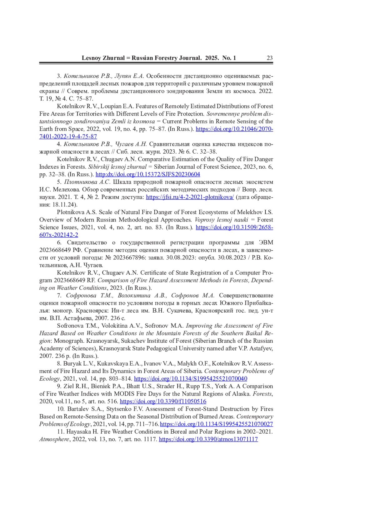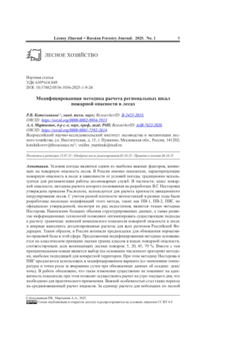 4. Котельников Р.В., Чугаев А.Н. Сравнительная оценка качества индексов пожарной опасности в лесах // Сиб. лесн. журн. 2023. No 6. С. 32-38. EDN: MJAZUV