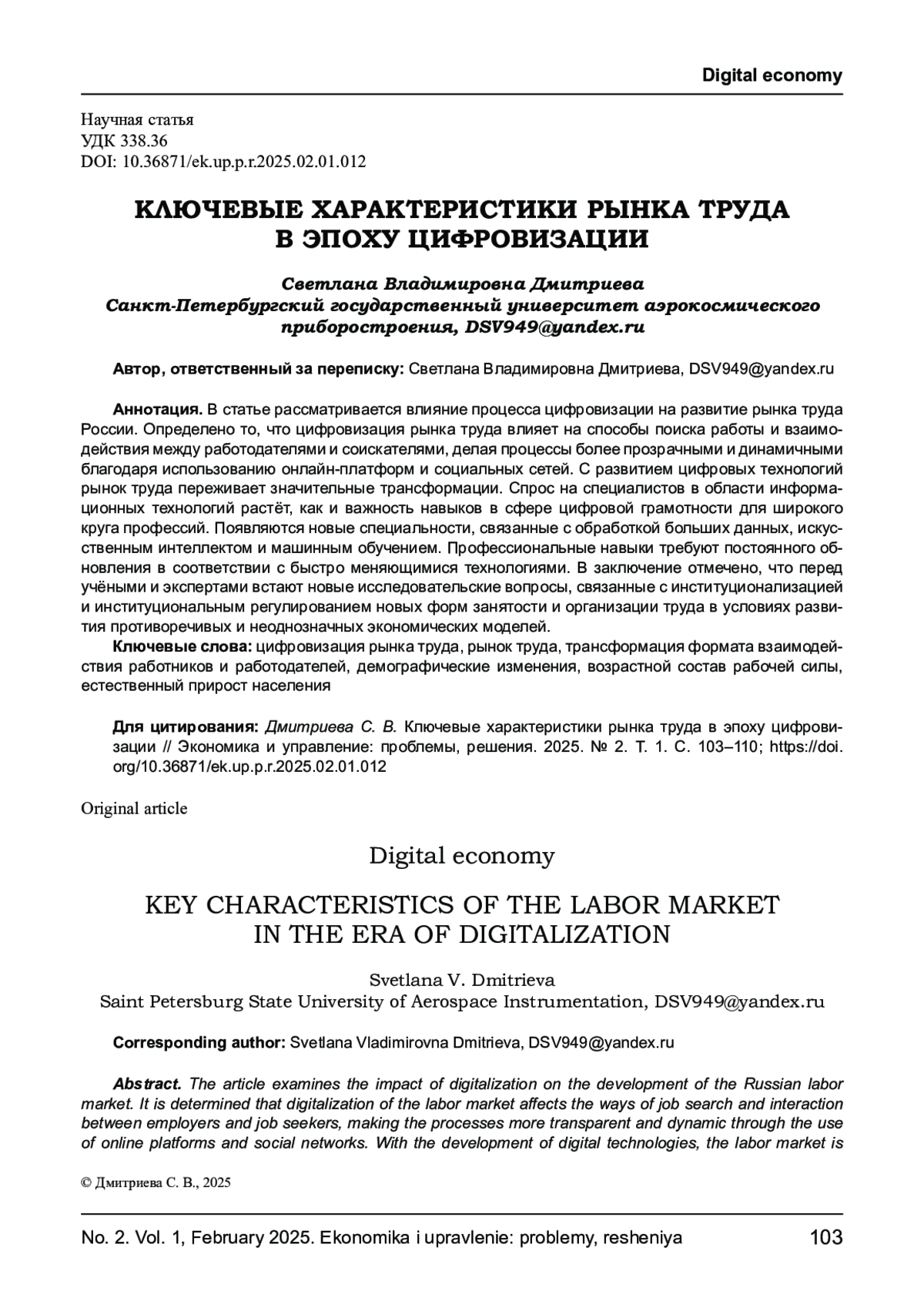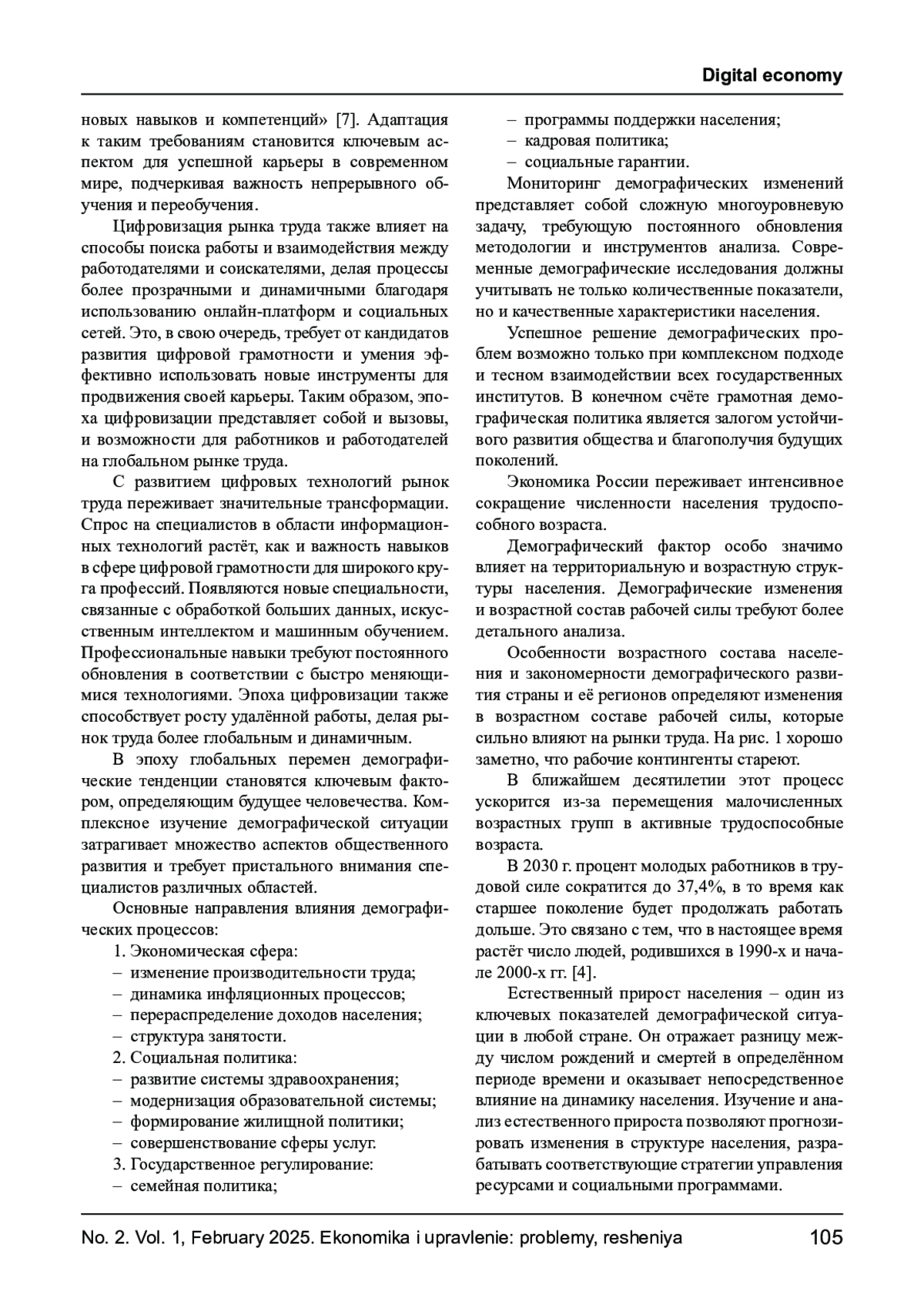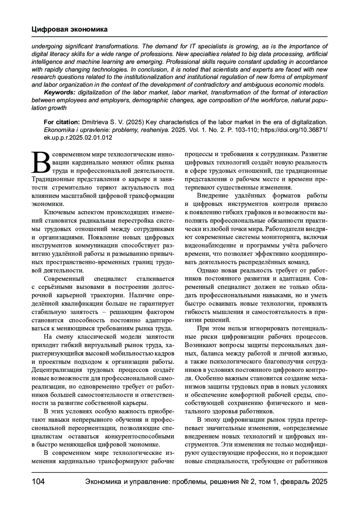 В статье рассматривается влияние процесса цифровизации на развитие рынка труда России. Определено то, что цифровизация рынка труда влияет на способы поиска работы и взаимодействия между работодателями и соискателями, делая процессы более прозрачными и динамичными благодаря использованию онлайн-платформ и социальных сетей. С развитием цифровых технологий рынок труда переживает значительные трансформации. Спрос на специалистов в области информационных технологий растёт, как и важность навыков в сфере цифровой грамотности для широкого круга профессий. Появляются новые специальности, связанные с обработкой больших данных, искусственным интеллектом и машинным обучением. Профессиональные навыки требуют постоянного обновления в соответствии с быстро меняющимися технологиями. В заключение отмечено, что перед учёными и экспертами встают новые исследовательские вопросы, связанные с институционализацией и институциональным регулированием новых форм занятости и организации труда в условиях развития противоречивых и неоднозначных экономических моделей.