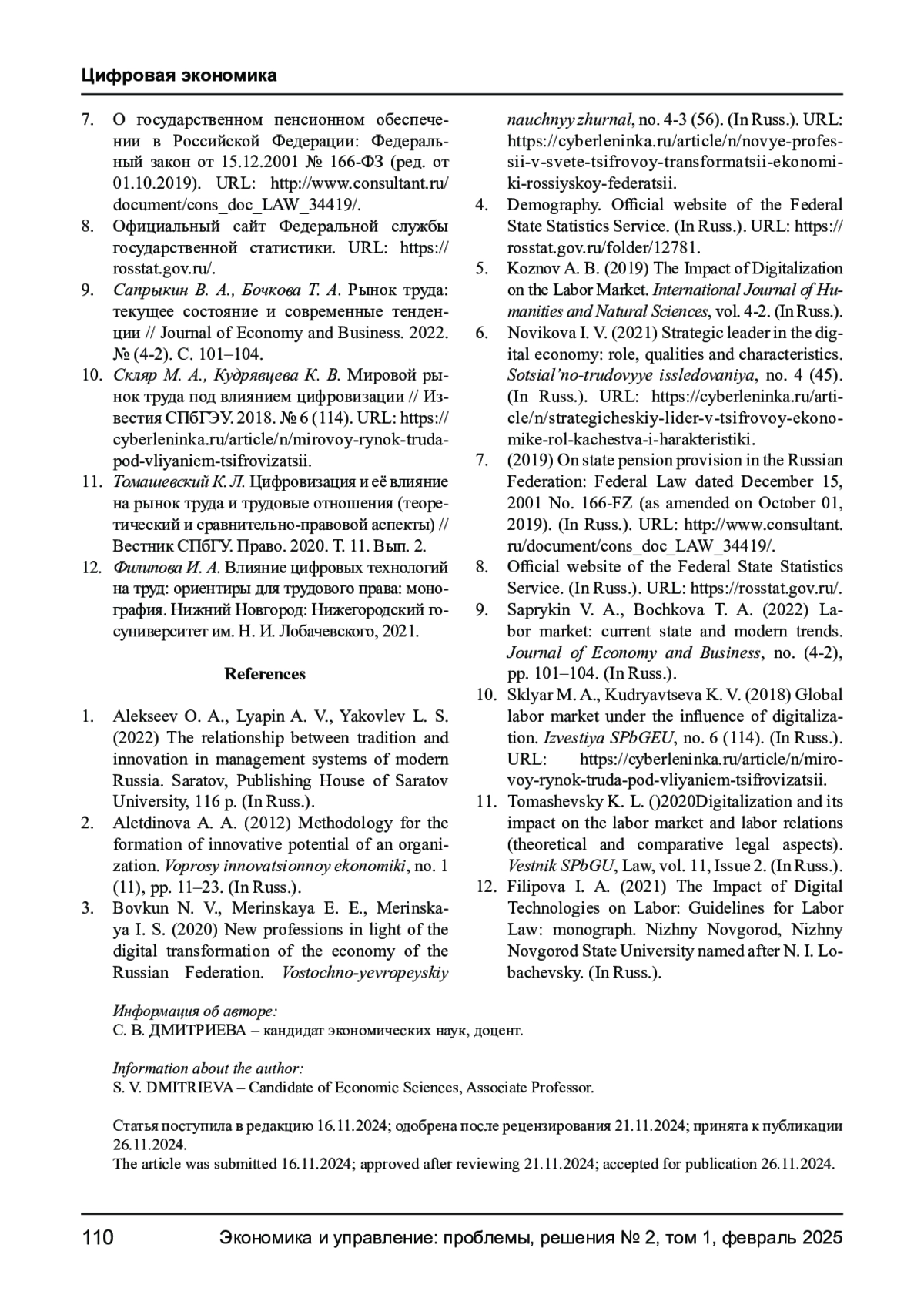 10. Скляр М. А., Кудрявцева К. В. Мировой рынок труда под влиянием цифровизации // Известия СПбГЭУ. 2018. № 6 (114). URL: https://cyberleninka.ru/article/n/mirovoy-rynok-trudapod-vliyaniem-tsifrovizatsii.