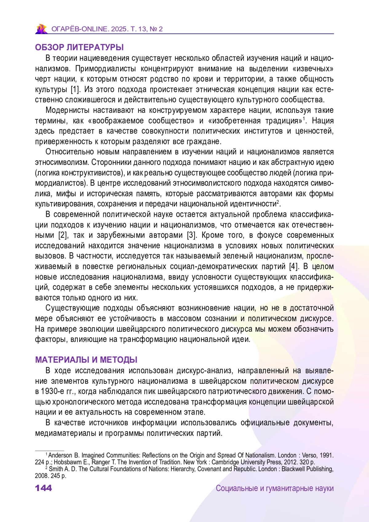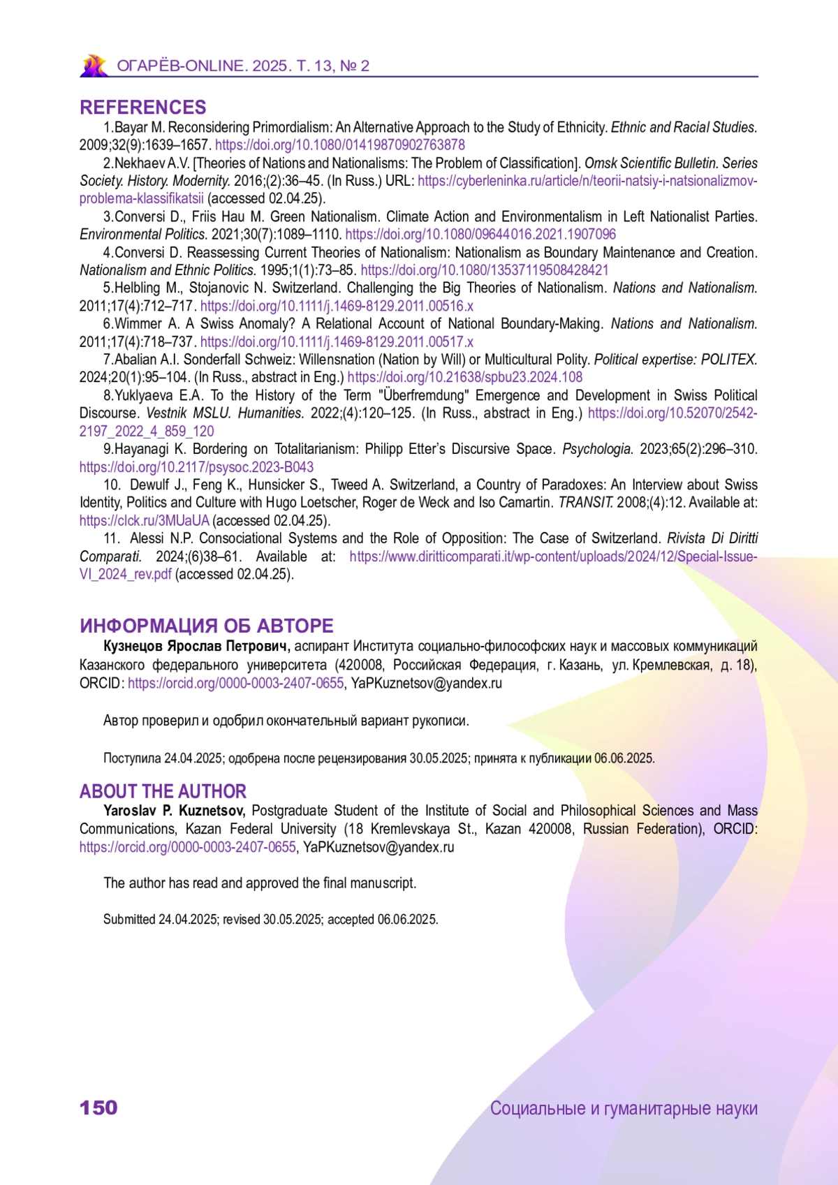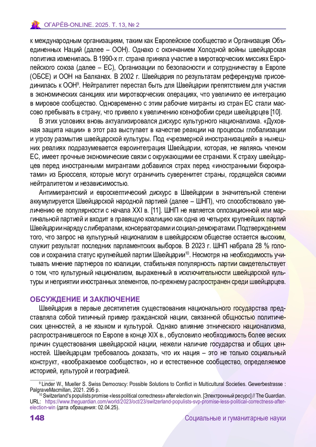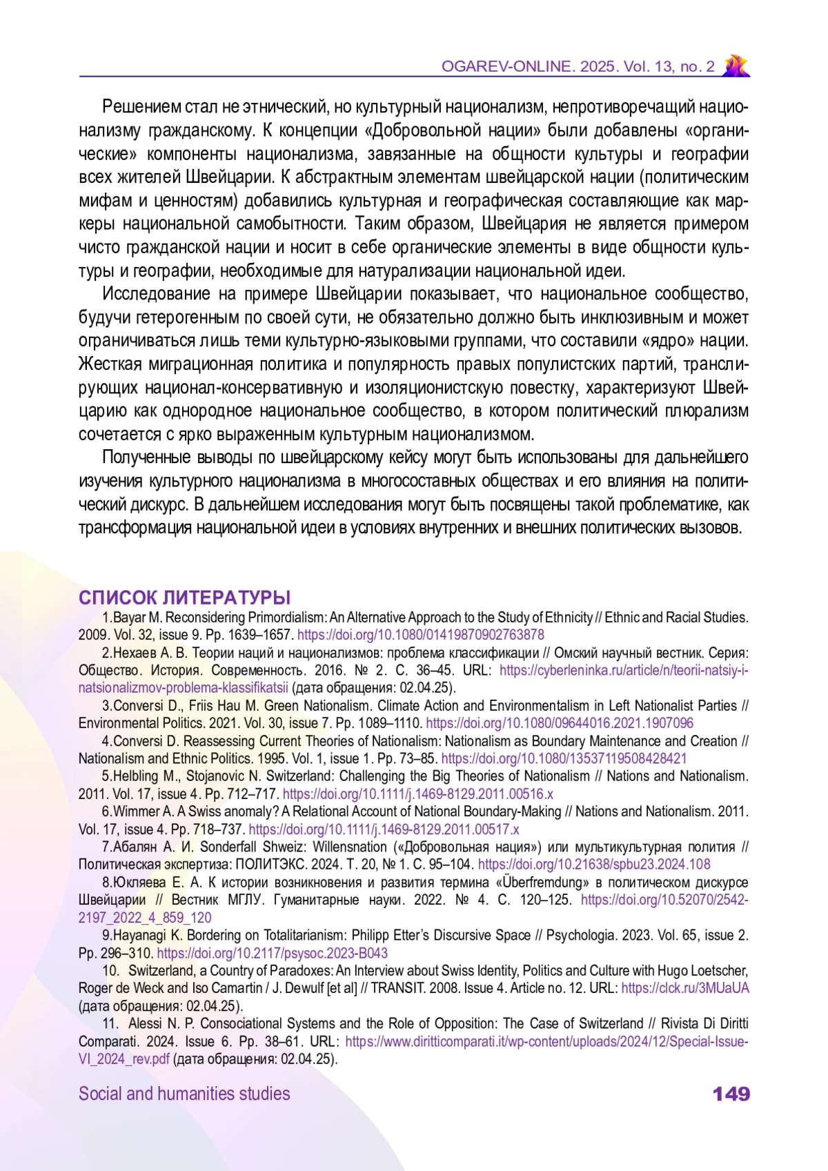 КУЗНЕЦОВ Я. П. КУЛЬТУРНЫЙ НАЦИОНАЛИЗМ В ПОЛИТИКЕ ШВЕЙЦАРИИ // ОГАРЁВ-ONLINE. 2025. № 2 (219), ТОМ 13