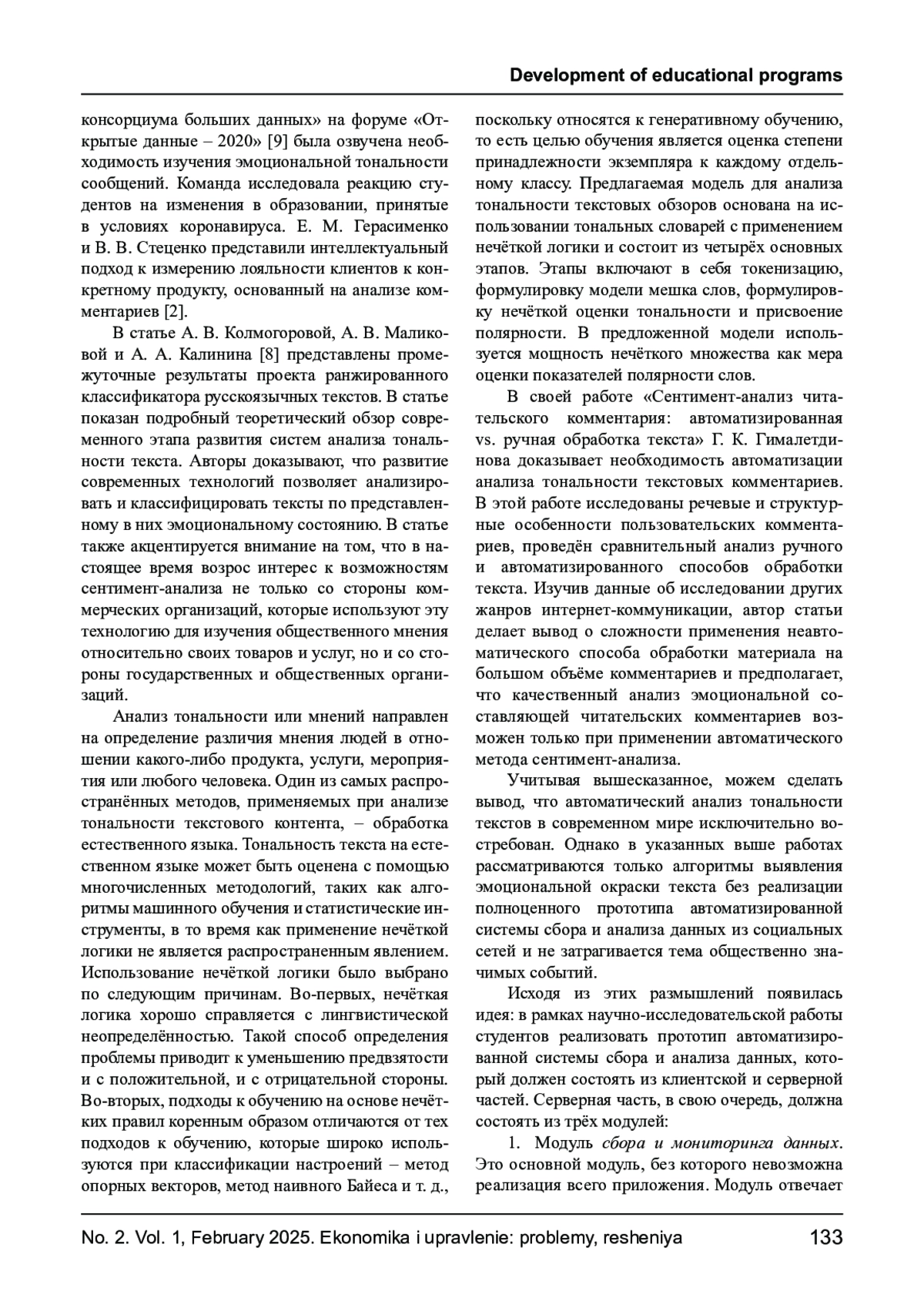 2. Герасименко Е. М., Стеценко В. В. Интеллектуальная система анализа тональности для измерения лояльности покупателей и принятия решений, основанная на нечёткой логике // Известия Южного федерального университета. Технические науки. 2021. № 4. С. 42-49. EDN: CQIIIO