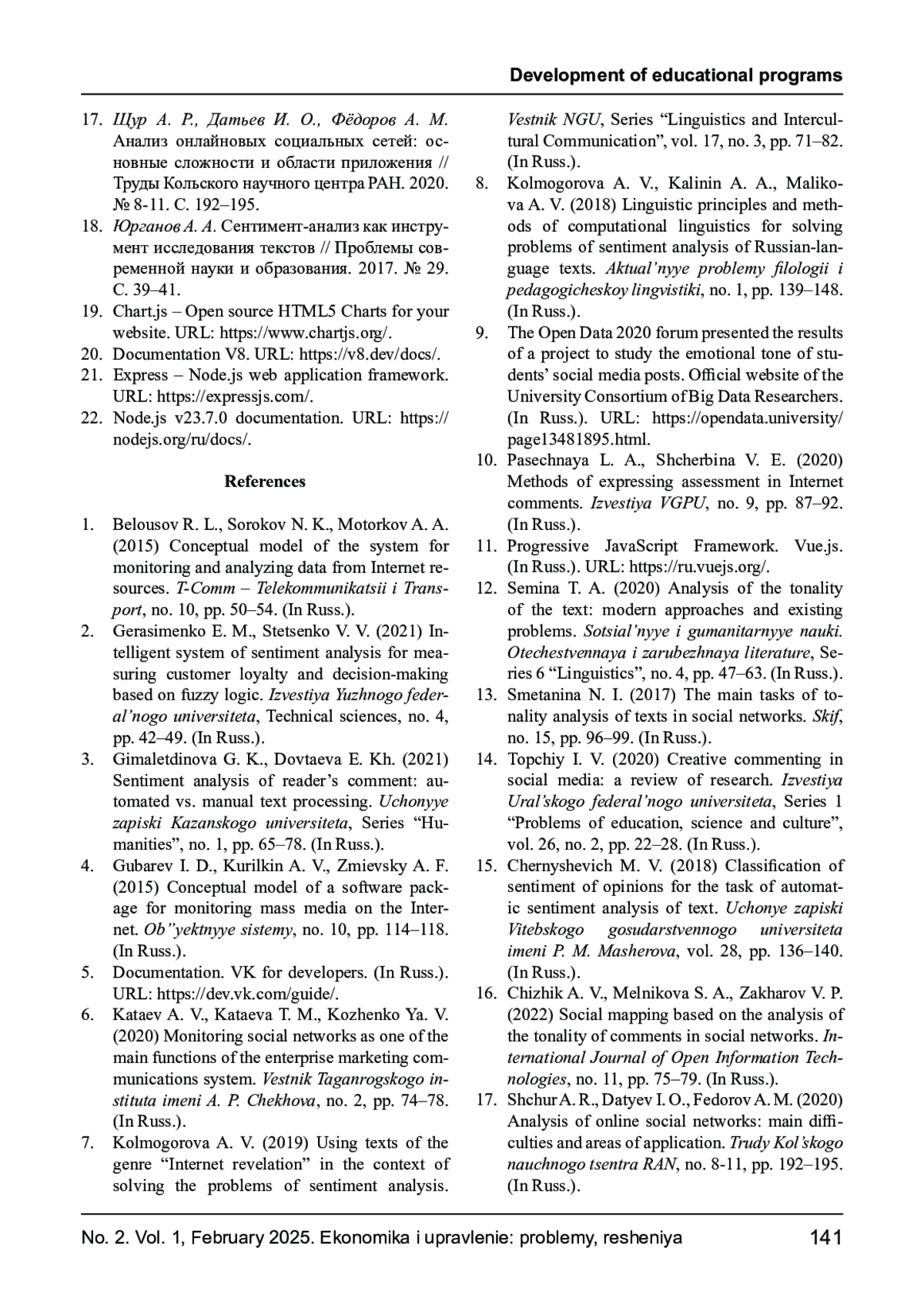 8. Колмогорова А. В., Калинин А. А., Маликова А. В. Лингвистические принципы и методы компьютерной лингвистики для решения задач сентимент-анализа русскоязычных текстов // Актуальные проблемы филологии и педагогической лингвистики. 2018. № 1. С. 139-148. EDN: YRHARM