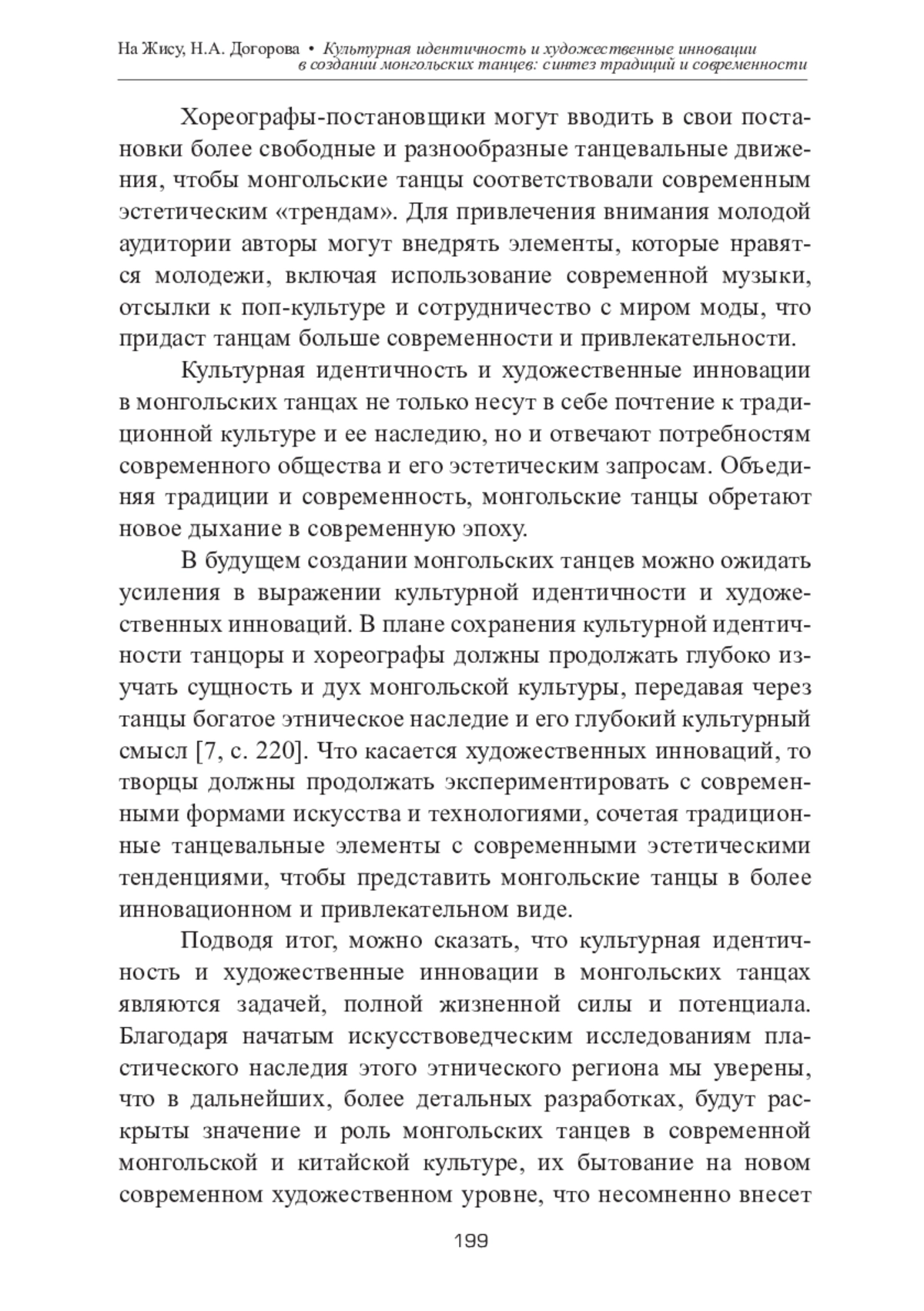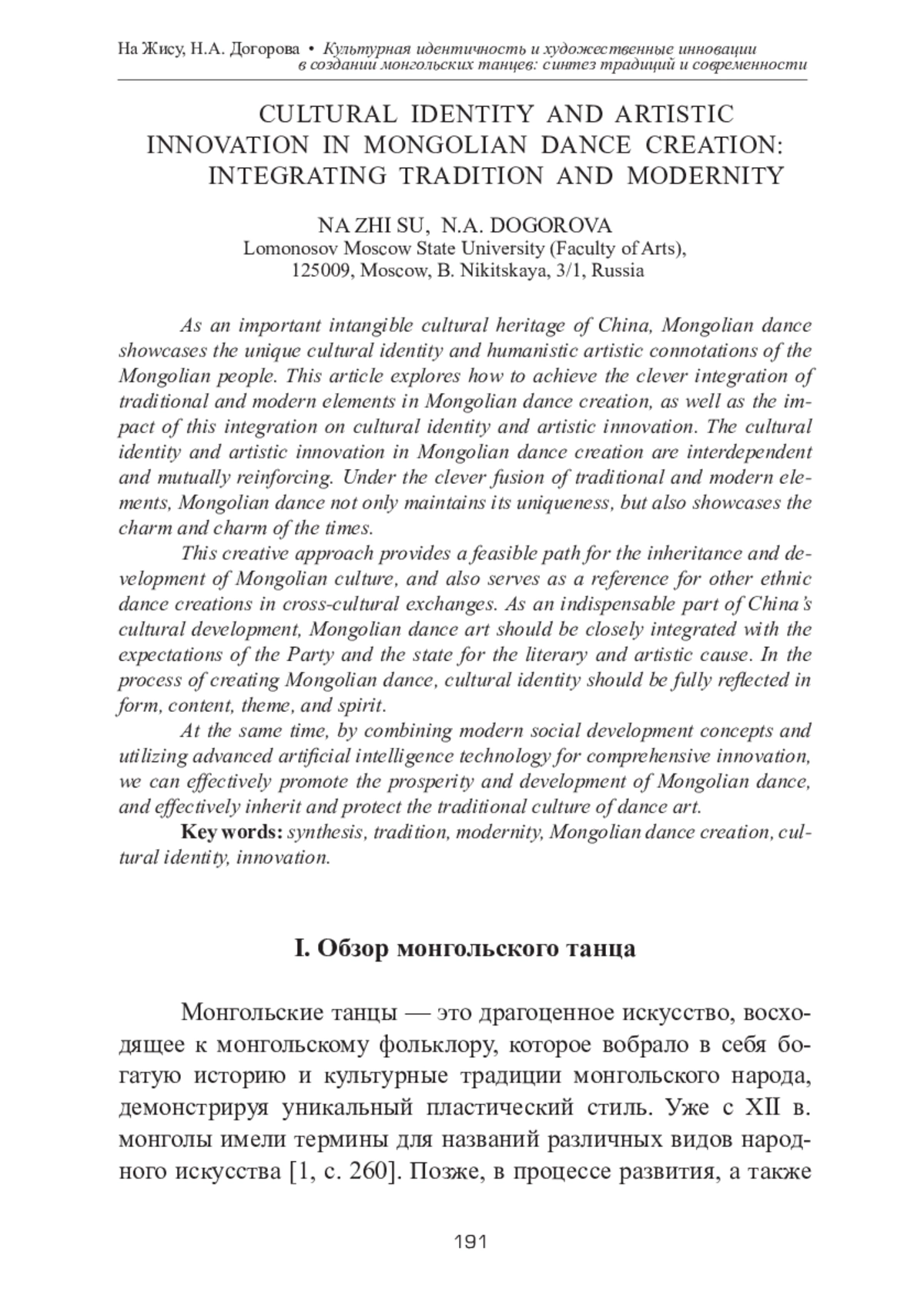 Монгольские танцы, являясь важным нематериальным культурным наследием Китая, демонстрируют уникальную культурную идентичность и гуманитарные художественные ценности монгольского народа. В данной статье рассматривается, как в процессе создания монгольских танцев происходит искусное слияние традиционных и современных элементов, а также влияние этого слияния на культурную идентичность и художественные инновации. Культурная идентичность и художественные инновации в создании монгольских танцев взаимозависимы и взаимно поддерживают друг друга. Благодаря искусному сочетанию традиционных и современных элементов, монгольские танцы сохраняют свою уникальность и одновременно демонстрируют очарование и дух времени. Такой подход к творчеству предоставляет реальный путь для сохранения и развития монгольской культуры, а также служит примером для создания танцев других народов в контексте межкультурного обмена. Монгольское танцевальное искусство, являясь неотъемлемой частью культурного строительства Китая, должно быть тесно связано с ожиданиями партии и государства в отношении культурной деятельности. В процессе создания монгольских танцев следует в полной мере отражать культурную идентичность в формах, содержании, темах и духе. В статье отмечается необходимость учитывать концепции развития современного общества и использовать передовые технологии искусственного интеллекта для всесторонних инноваций, что будет способствовать процветанию монгольских танцев и эффективному сохранению и защите традиционной танцевальной культуры.