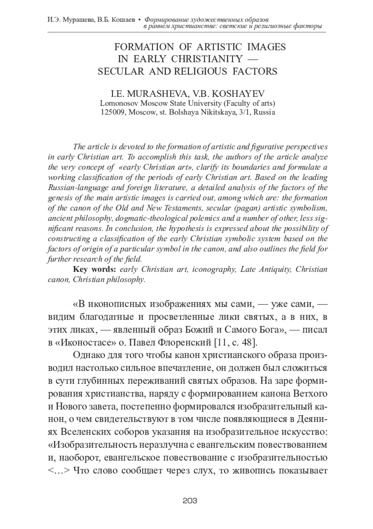 Статья посвящена вопросам формирования художественно-образных перспектив в раннехристианском искусстве. Для выполнения поставленной задачи авторы статьи анализируют само понятие «раннехристианское искусство», уточняют его границы и формулируют рабочую классификацию периодов раннехристианского искусства. На основе ведущей русскоязычной и зарубежной литературы проводится подробный анализ факторов генезиса основных художественных образов, среди которых можно выделить: формирование канона Ветхого и Нового заветов, светский (языческий) художественный символизм, античную философию, догматически-богословскую полемику и ряд других, менее значимых причин. В заключении высказывается гипотеза о возможности построения классификации раннехристианской символической системы на основании факторов происхождения того или иного символа в каноне, а также очерчивается поле для дальнейших исследований области.