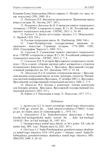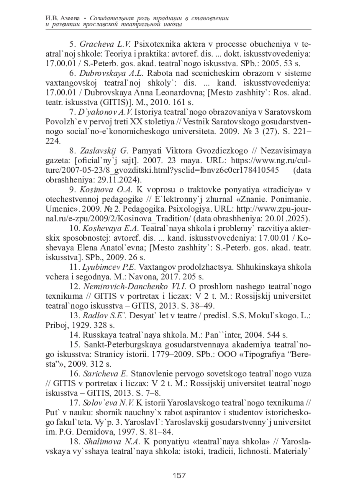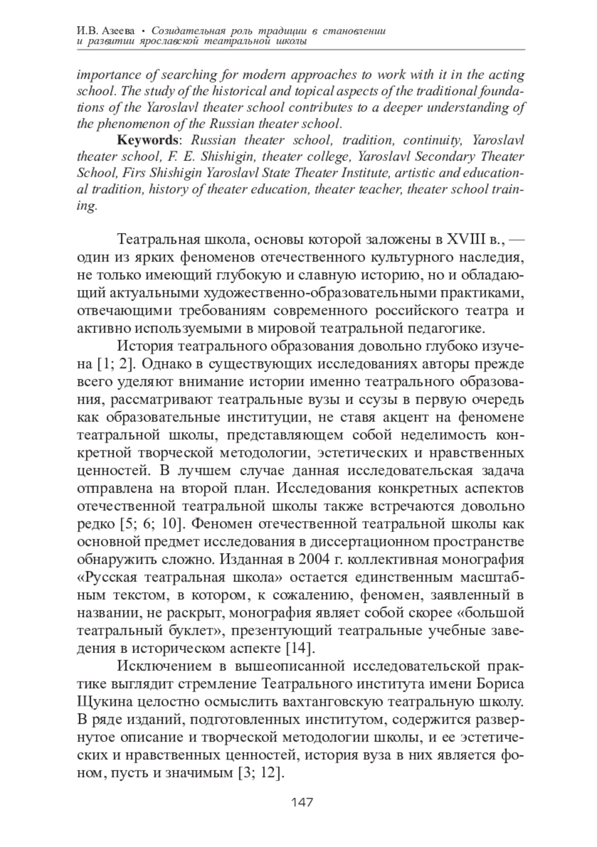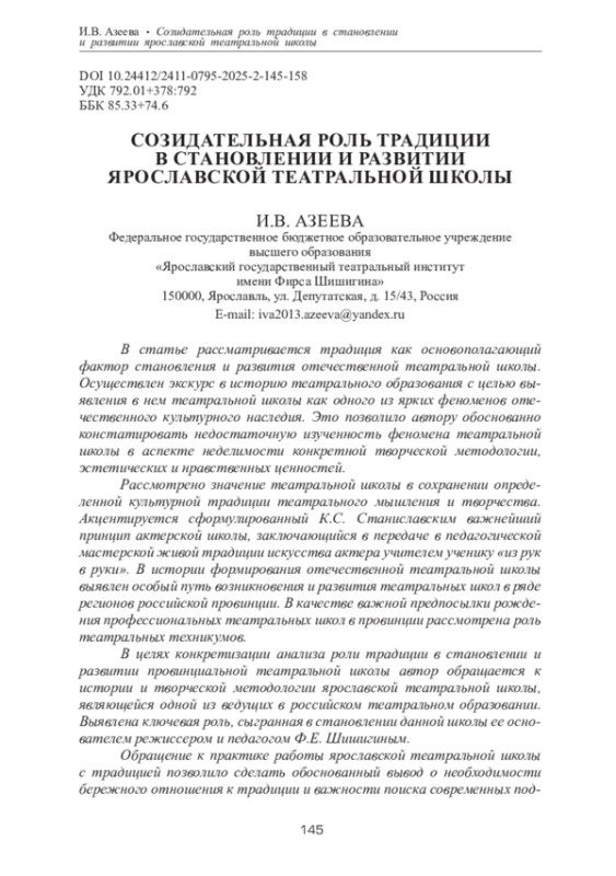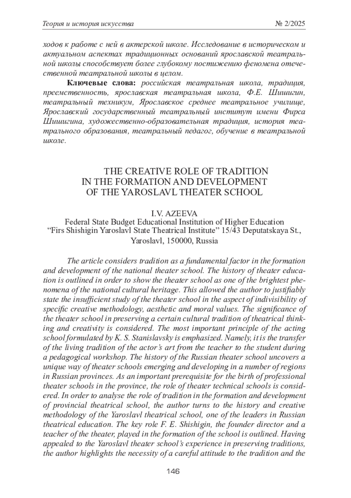 АЗЕЕВА И. В. СОЗИДАТЕЛЬНАЯ РОЛЬ ТРАДИЦИИВ СТАНОВЛЕНИИ И РАЗВИТИИЯРОСЛАВСКОЙ ТЕАТРАЛЬНОЙ ШКОЛЫ // ТЕОРИЯ И ИСТОРИЯ ИСКУССТВА. 2025. № 2